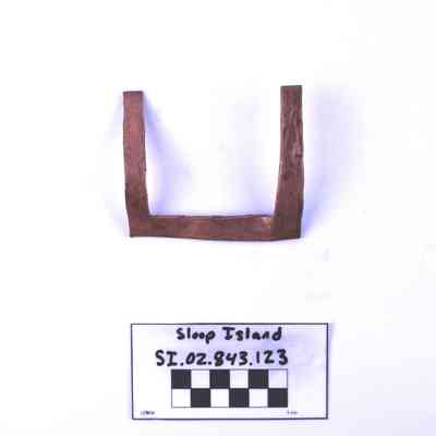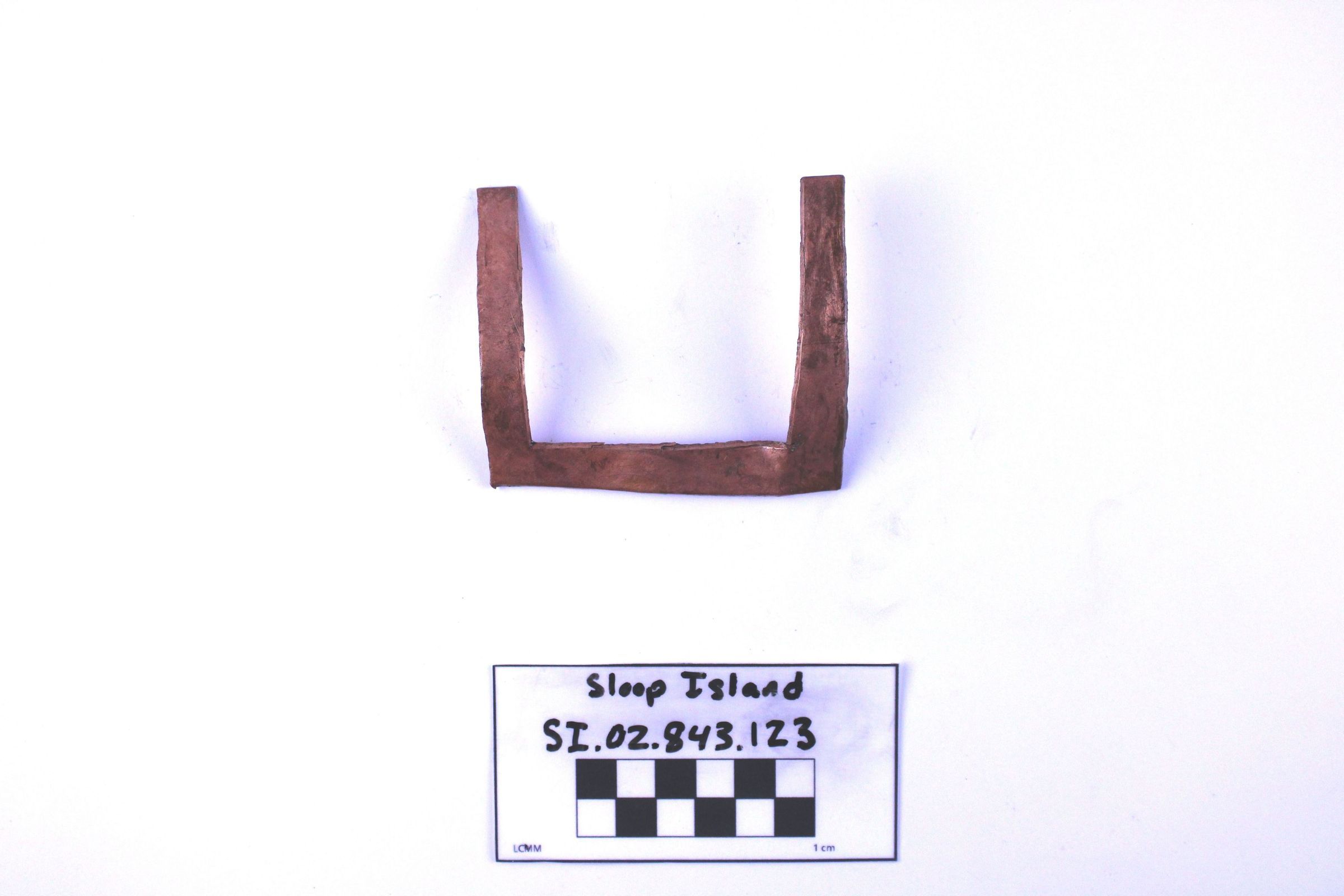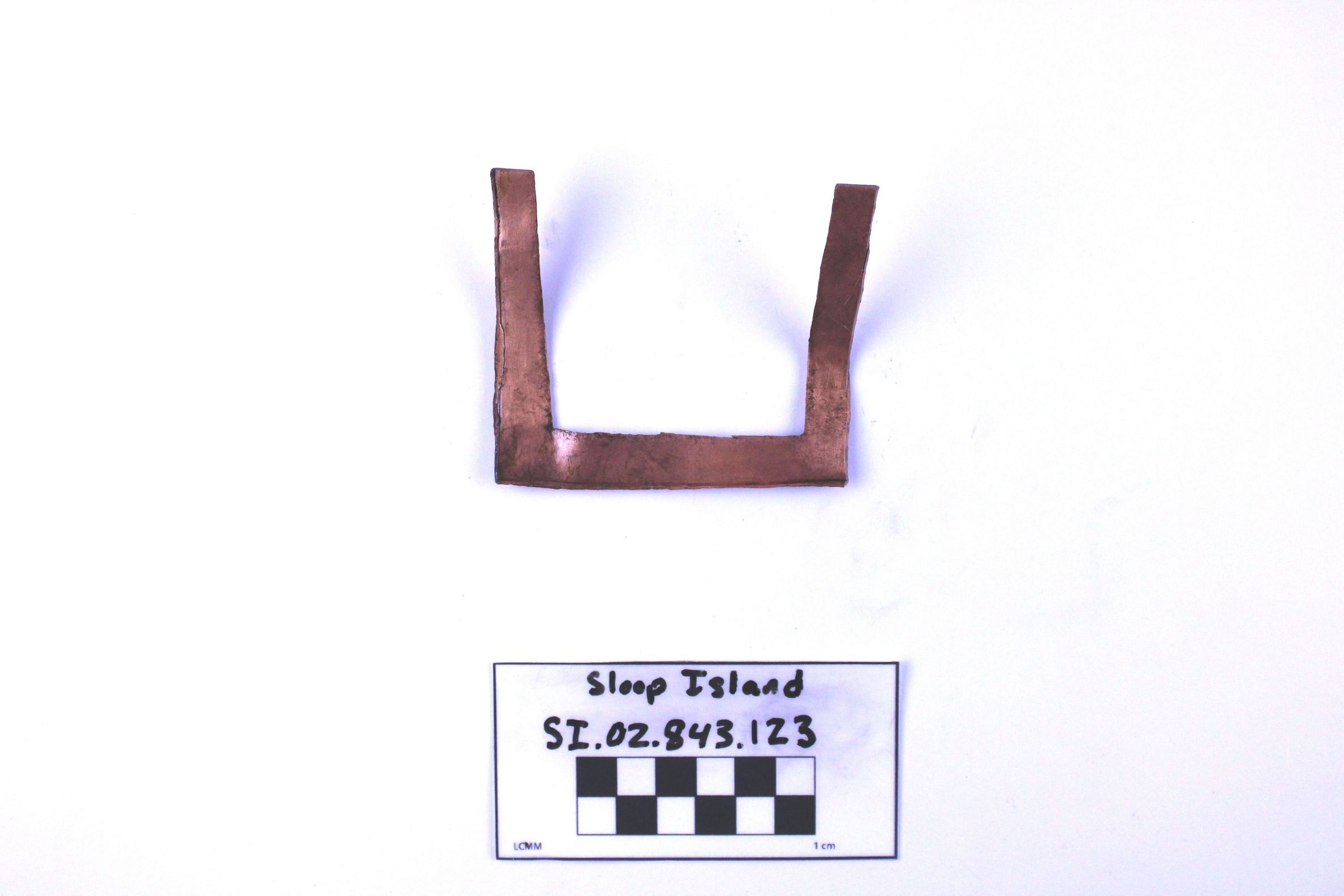 Object SI.02.843.123 is a flat copper object. It is in a partial square shape with two (2) of the sides bent.Use