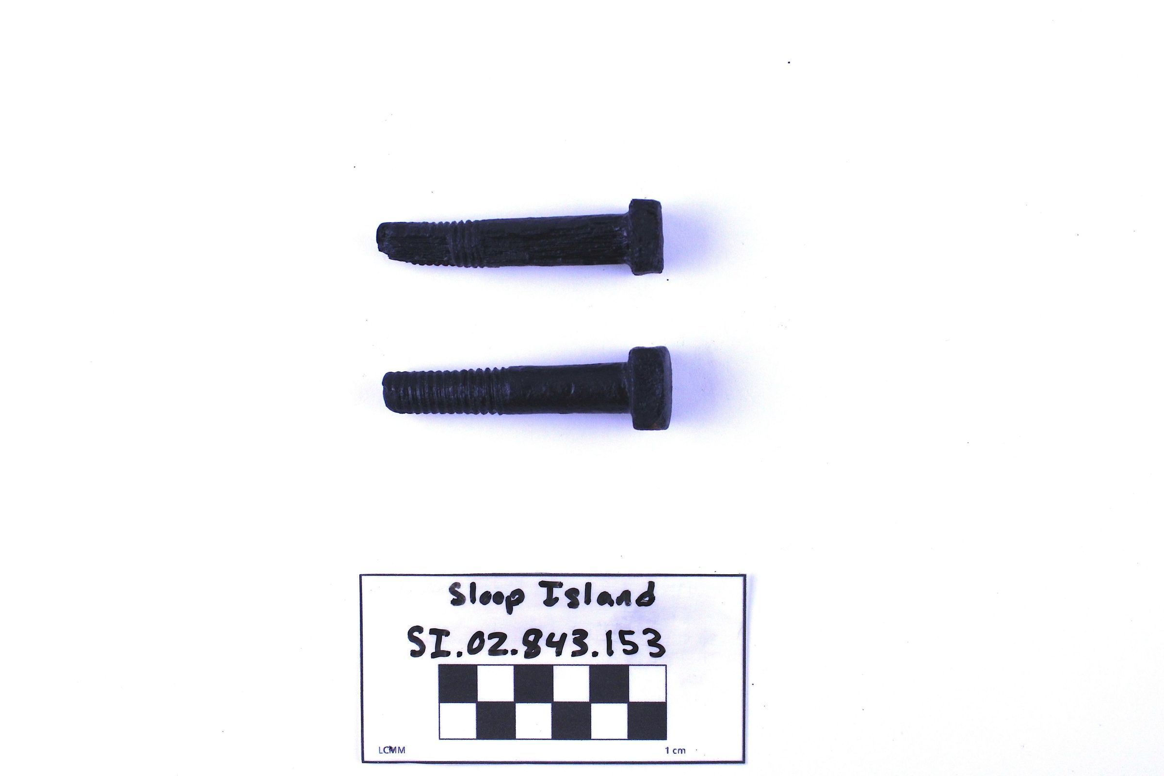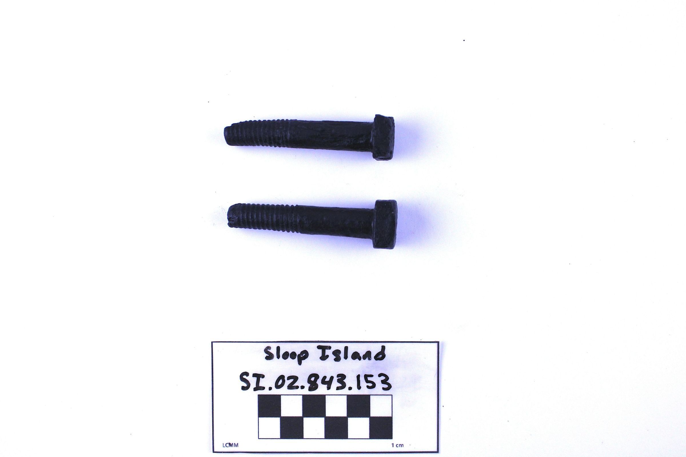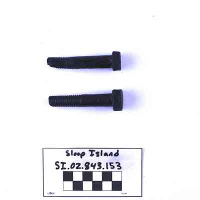 Object SI.02.843.153 is a lot of two (2) iron course thread bolts. Both have square heads. The screw ridging is still visible, though a section is missing from one (1).Use