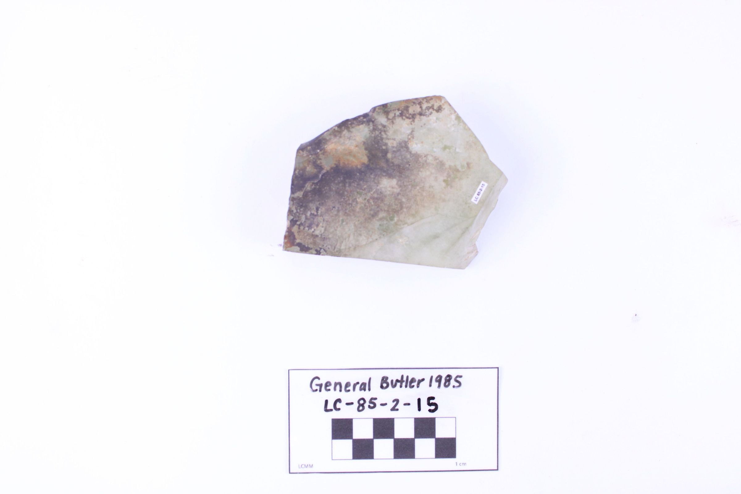 Artifact LC-85-2-15 is a thick piece of clouded window glass. One side is significantly clouded with brown and orange discoloration.