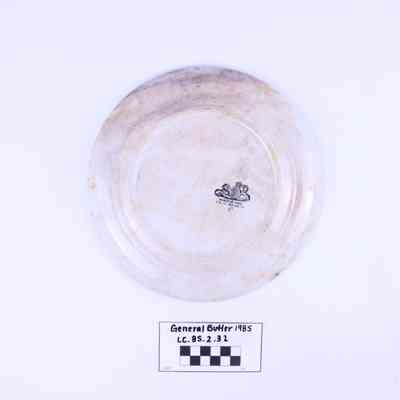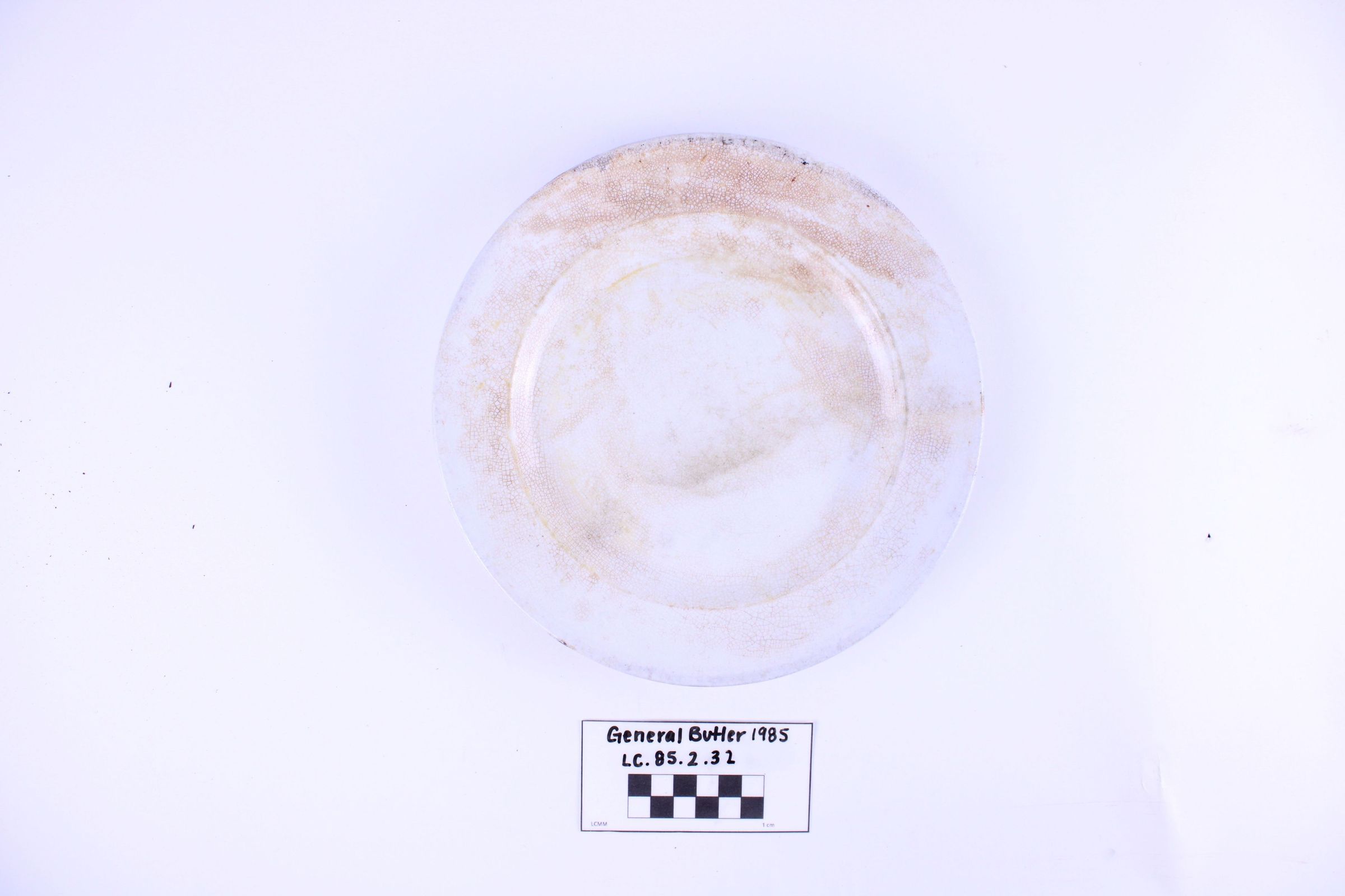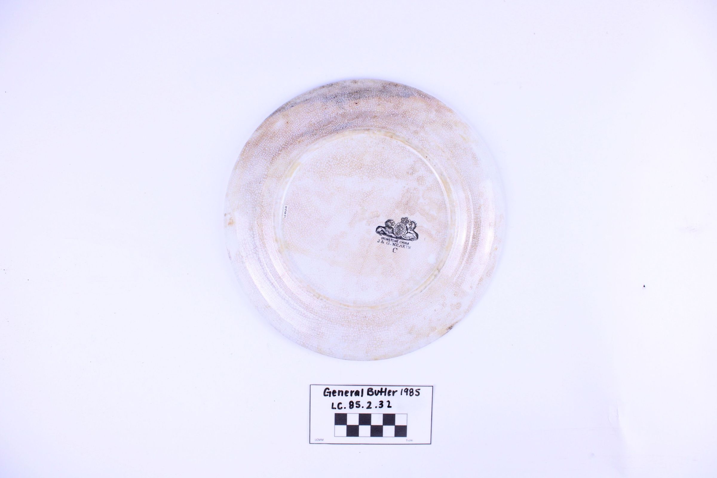 Artifact LC-85-2-32 is one (1) white ceramic plate from the General Butler. The plate has small chips and crazing along the rim, causing bands of brown discoloration across the face and rim. Makers mark at the base of the plate shows crest with a crown at center with a lion laying down on one side and a unicorn sitting on the other. Beneath is written Ironstone China, J. & G. Meakin, C