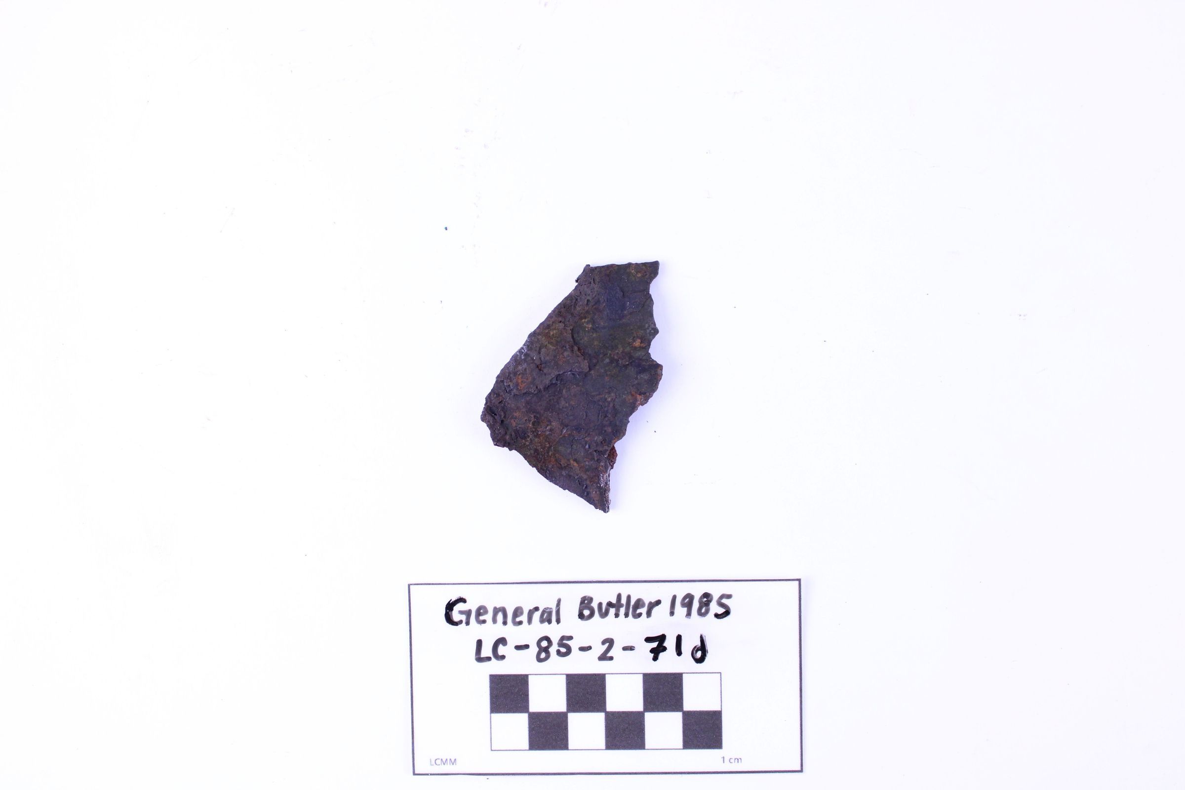 Artifact LC-85-2-71d is a fragment of a large cast iron pot. This piece is quite corroded, more so than many of its related fragments. The material is rough in texture.