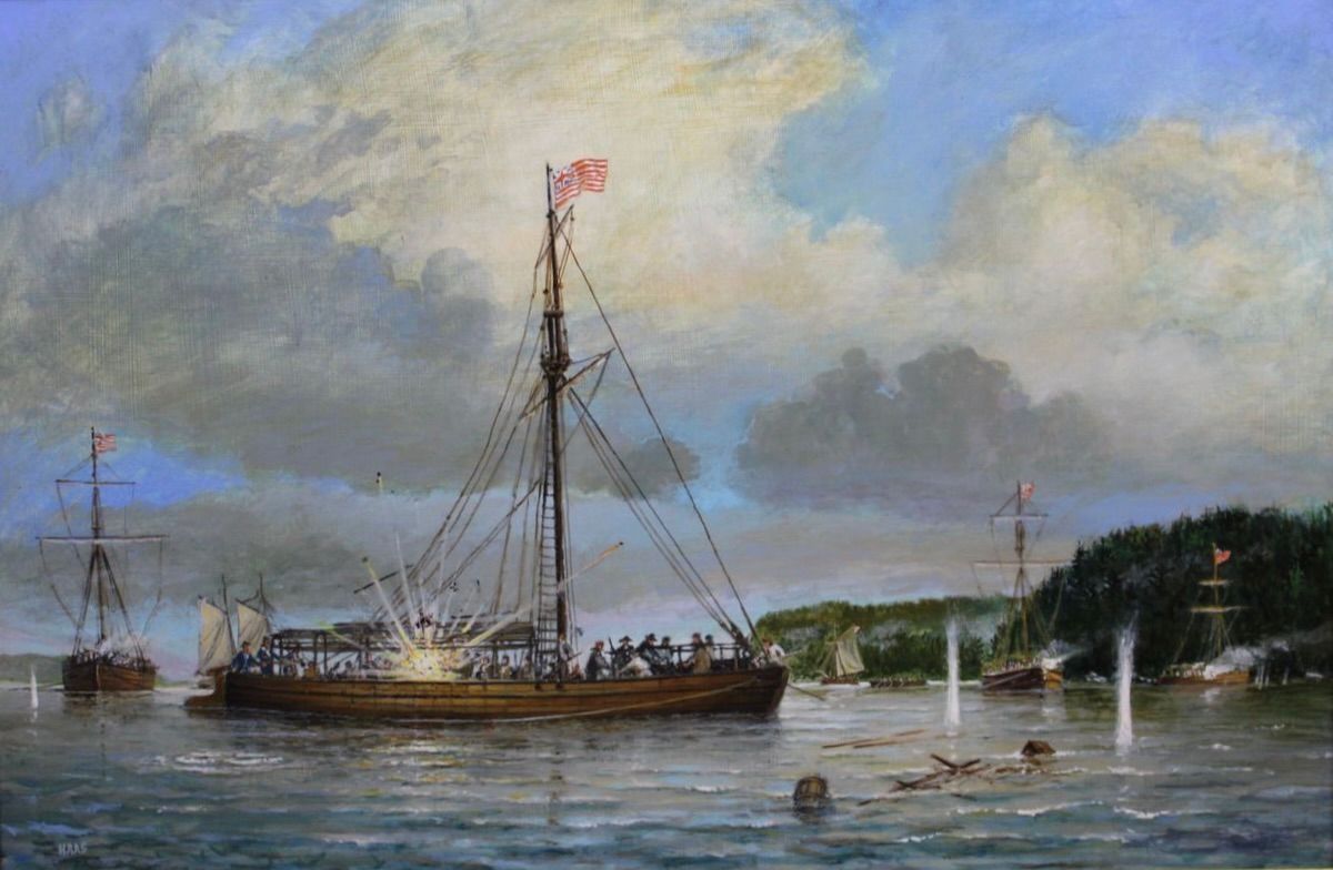 If reproduced, the credit line should read: Cannon Exploding on Gunboat New York. Ernest Haas, 2002. Acrylic on Panel. 20in x 30in. Lake Champlain Maritime Museum Collection.