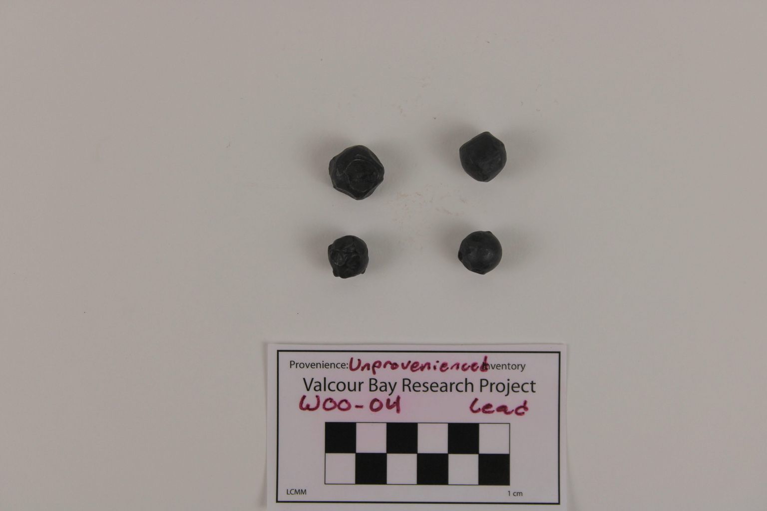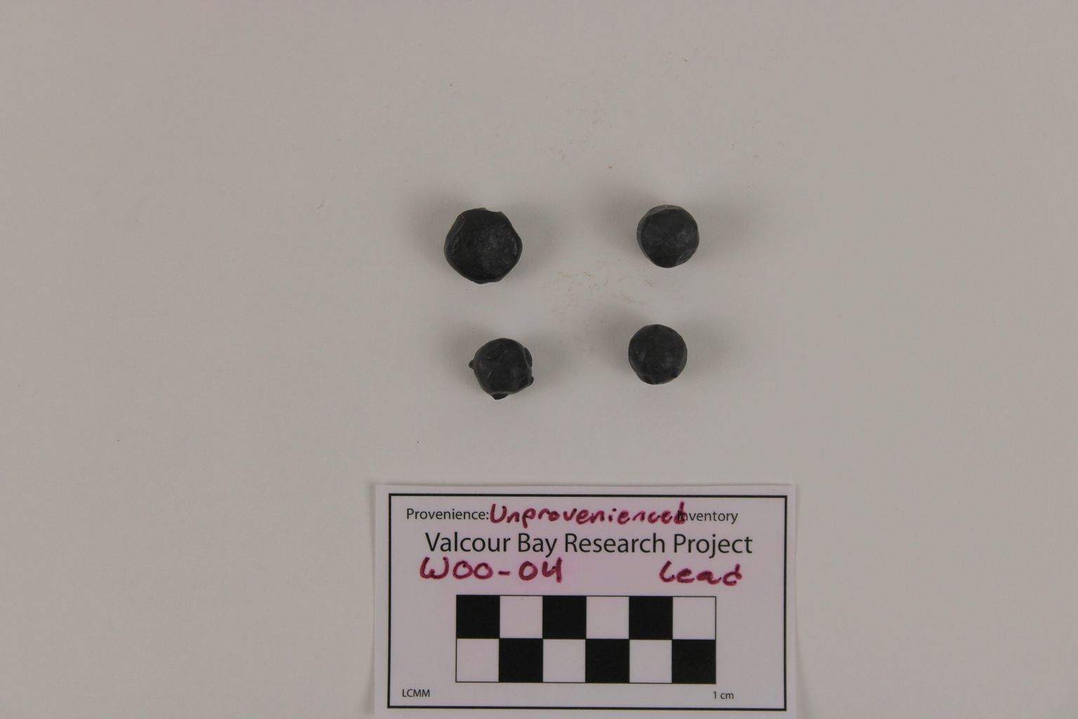 Artifact lot W00-04 is a collection of four lead musket balls.