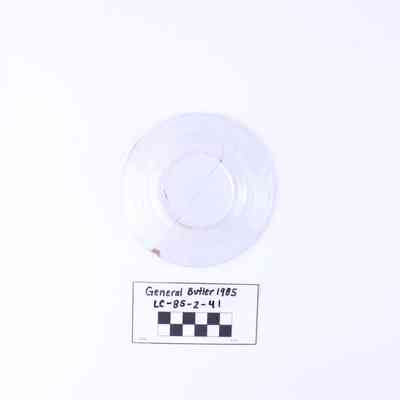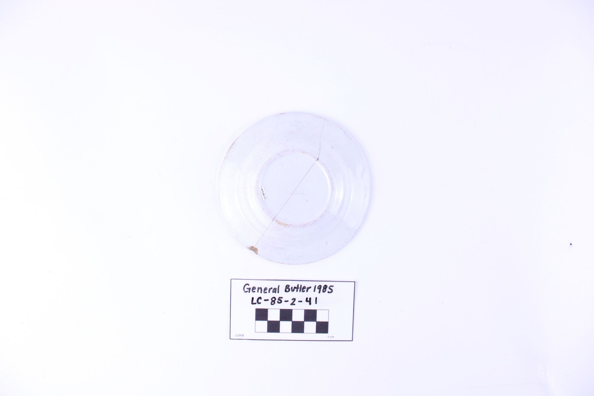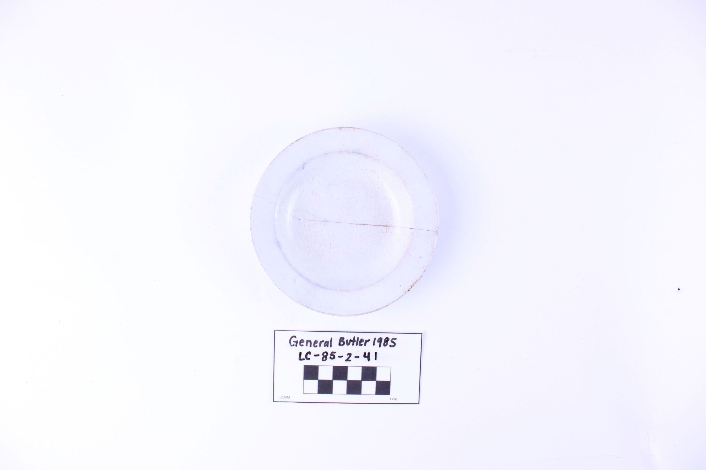 Artifact LC-85-2-41 is one (1) white ceramic plate. There is one small chip and crazing across the surface. The bottom is in a similar condition.