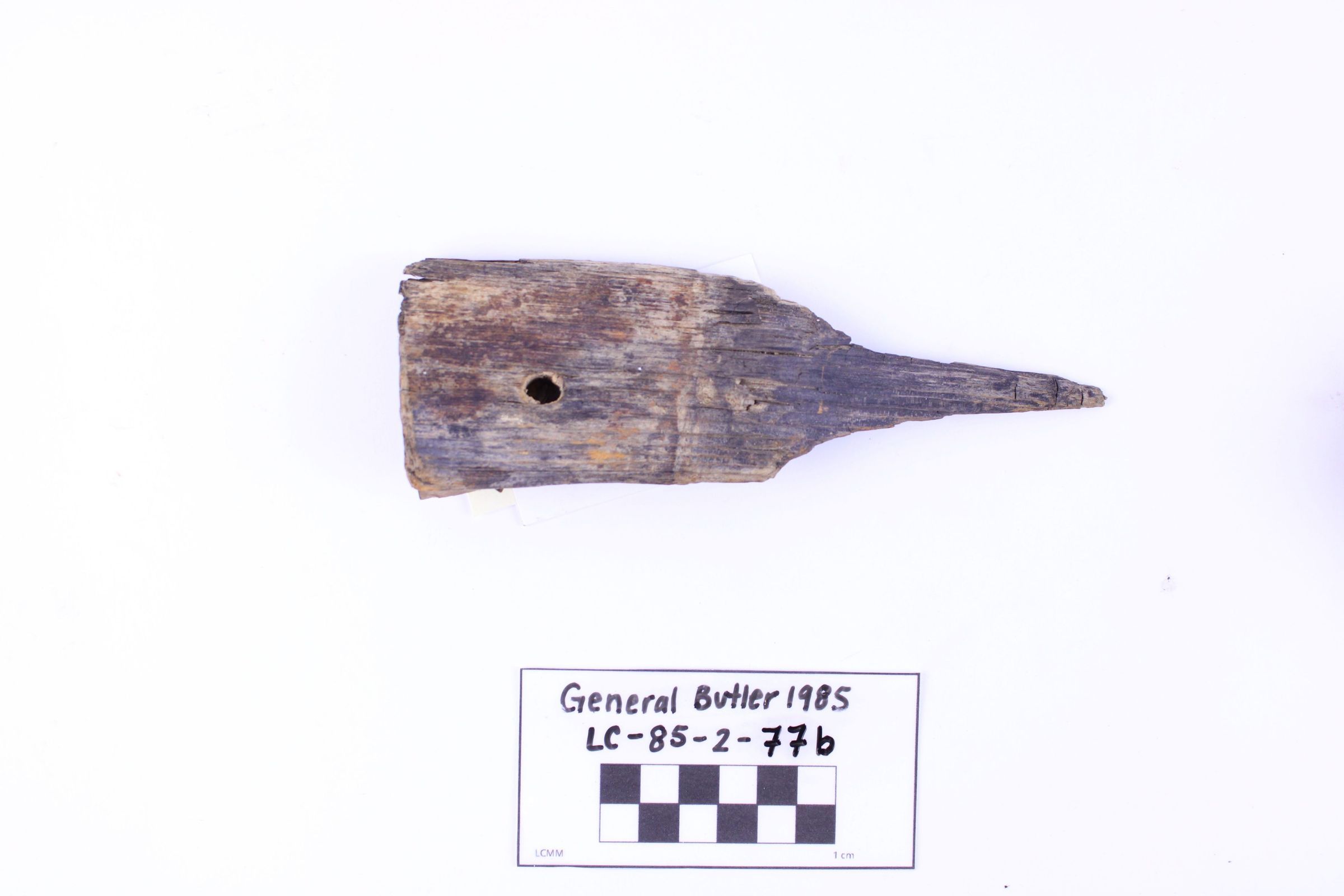 Artifact LC-85-2-77b is a fragment of an ax handle. The wood has splinted along the edges. A hole has been drilled into the center of the widest section of the handle. There is a faint line showing where the edge of the iron ax head used to be when these objects were once connected.Use