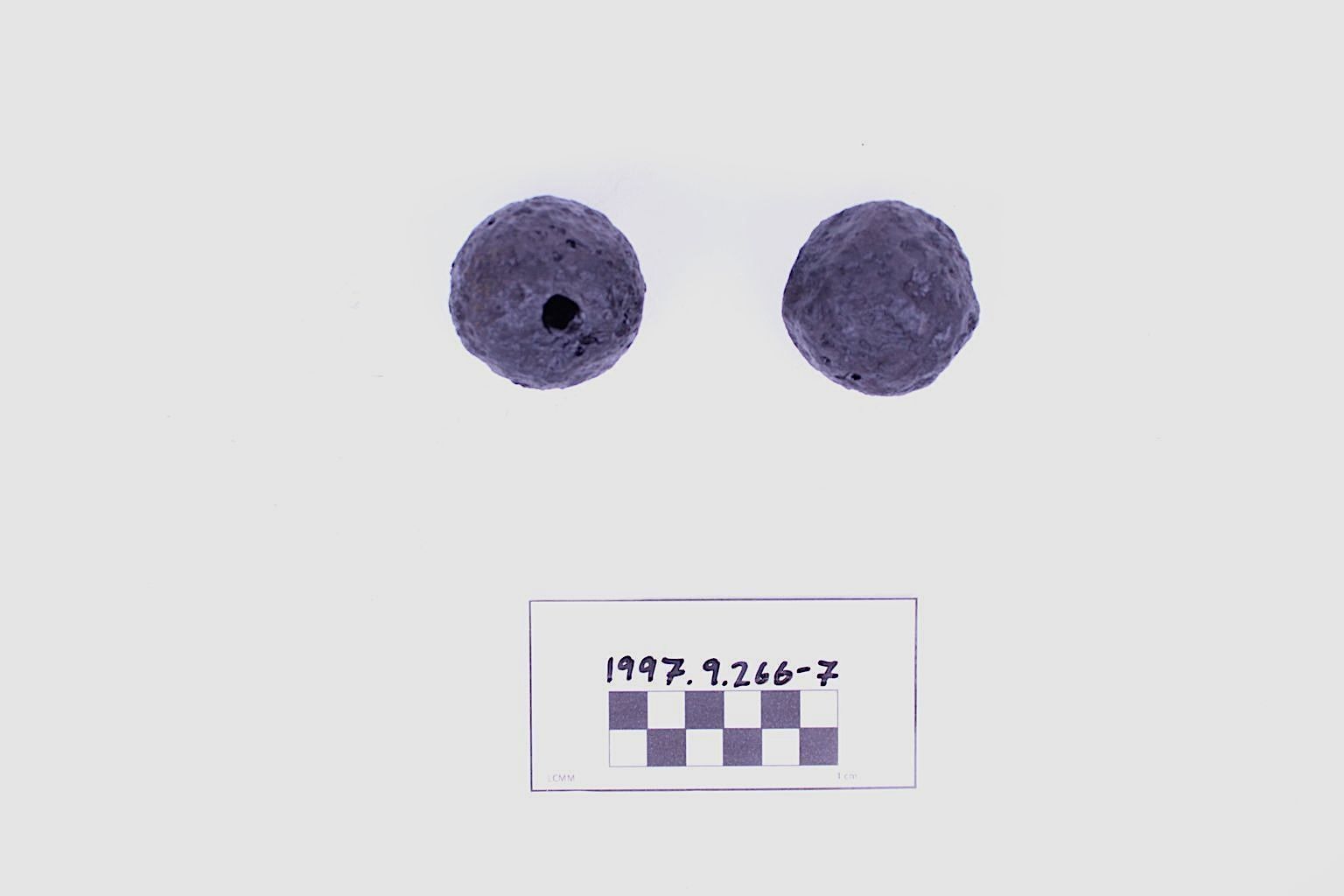 Artifacts 1997.9.0266-0267 are a lot of two (2) pieces of iron cluster shot.