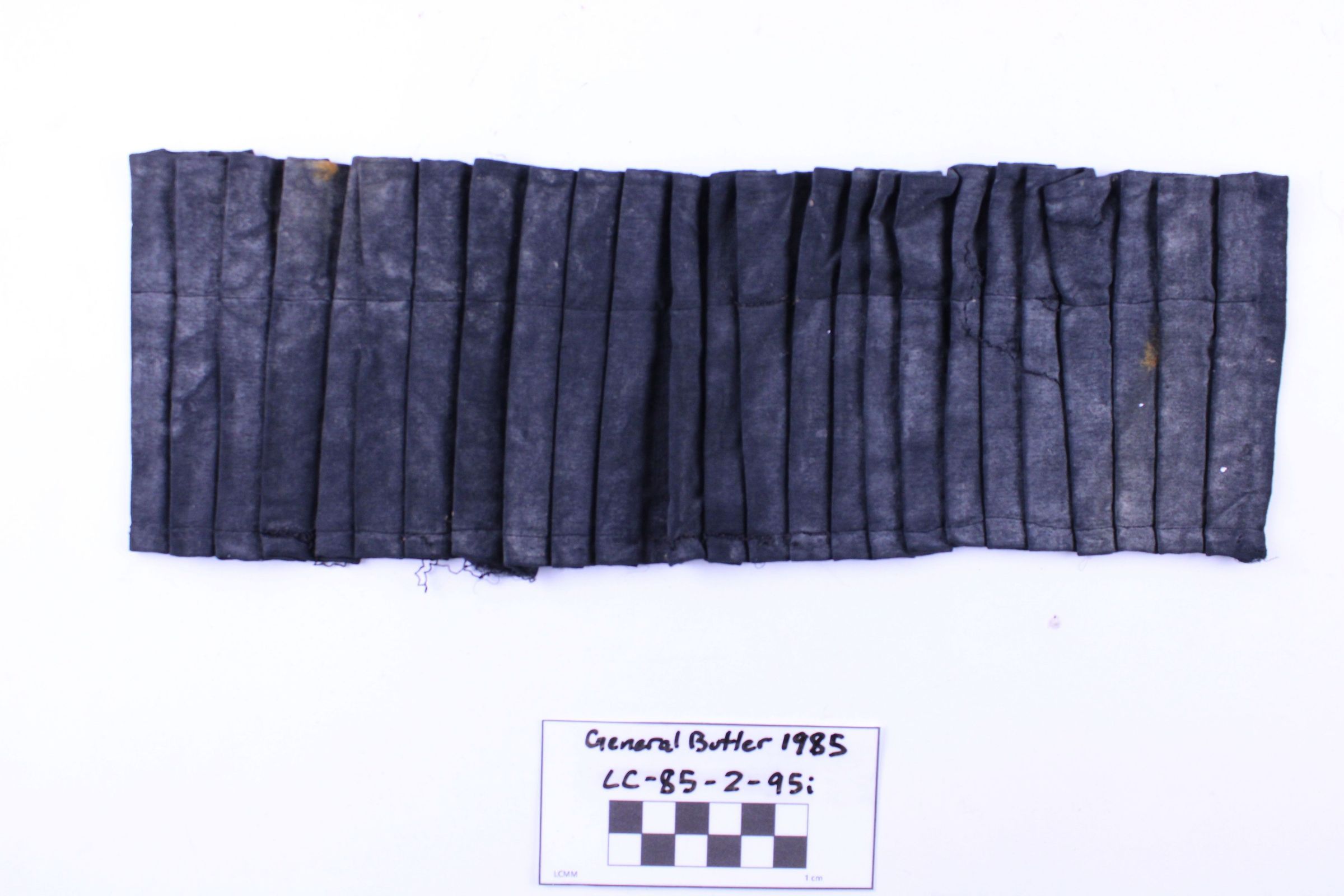 Artifact LC-85-2-95i is a section of pleated black cotton fabric from a walking skirt. It has some orange spots of discoloration. Much of the fabric has faded due to age.