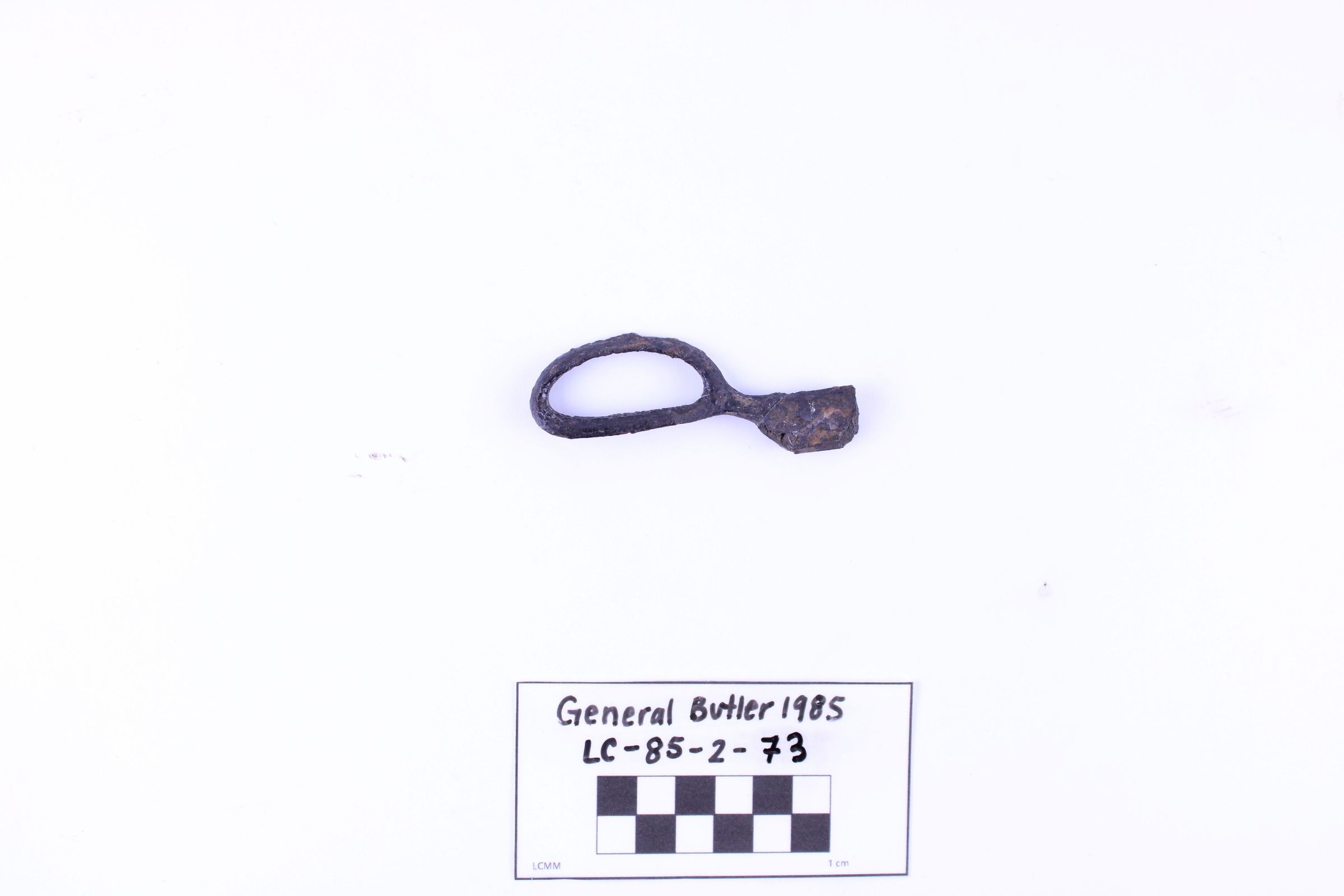 Artifact LC-85-2-73 is a fragment of a scissor handle. The surface of the material is somewhat rusted. The base of the handle ends in a small square where it would have connected to the blades of the scissors.Use