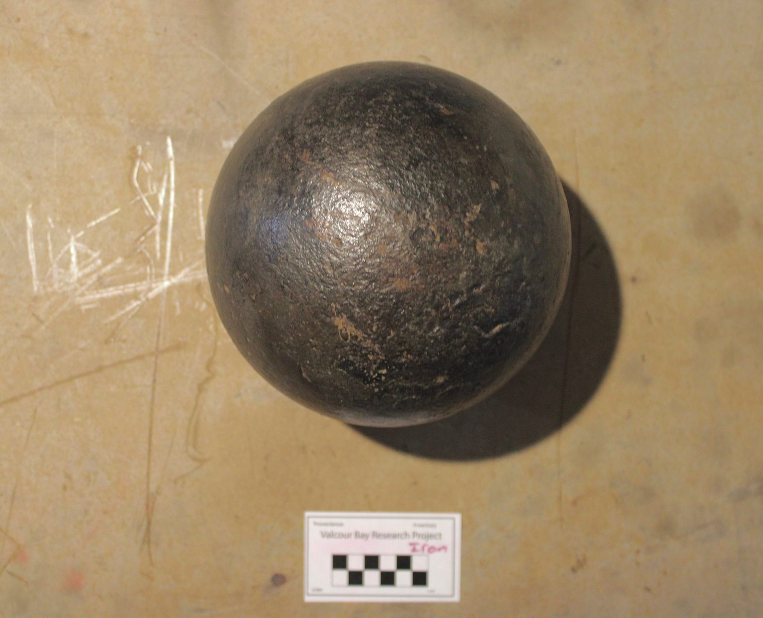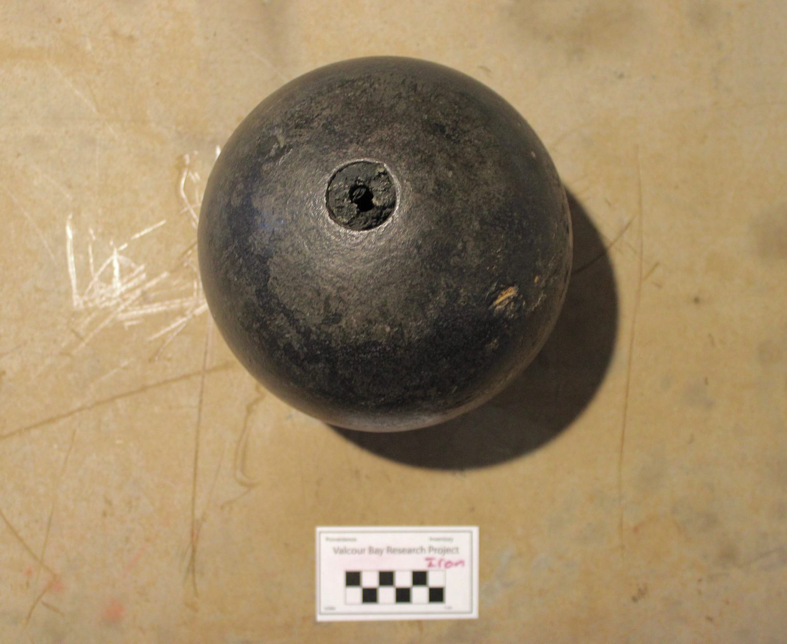 This artifact consists of a 41-pound (18.6kg), 8-in (20.3cm) diameter hollow cast iron sphere with 1in (2.5cm) thick walls. A slightly conical hole allows access to the powder cavity; it measures 1¼in (3.1cm) diameter at the top and 1⅛in (2.6cm) at the bottom. A portion of the wooden plug fuse was found in this hole. The fuse is made of a tapered piece of wood with a ⅜in (.95cm) hole bored through its 2in (5cm) length. This cavity would have been filled with a mixture of gunpowder, saltpeter, and alcohol that acted as the ignition mechanism for the large powder charge (approximately 2½ lbs [1.1kg]) located in the shell.