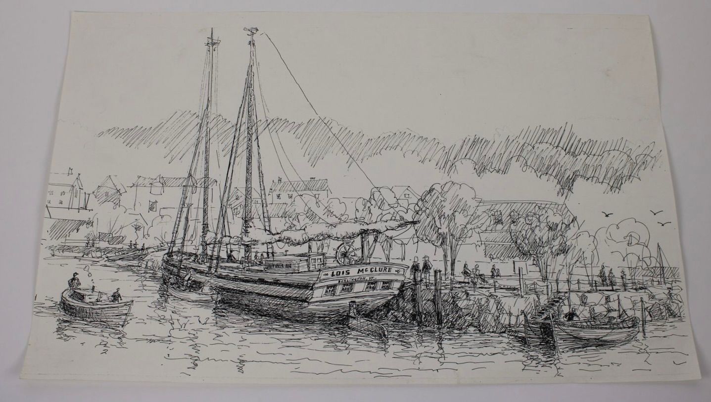 If reproduced, the credit line should read: Lois McClure Sketch. Ernest Haas, date unknown. Ink on paper. 15in x 24in. Lake Champlain Maritime Museum Collection.Reproductions