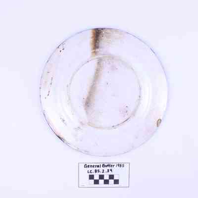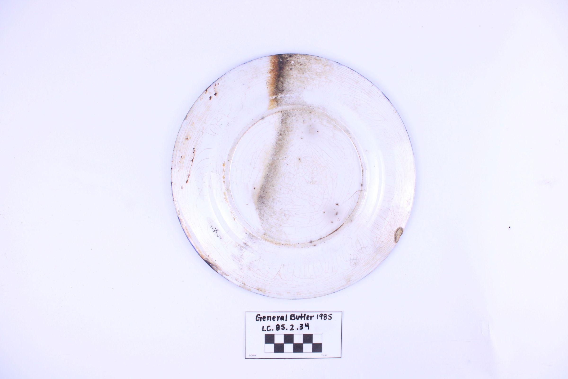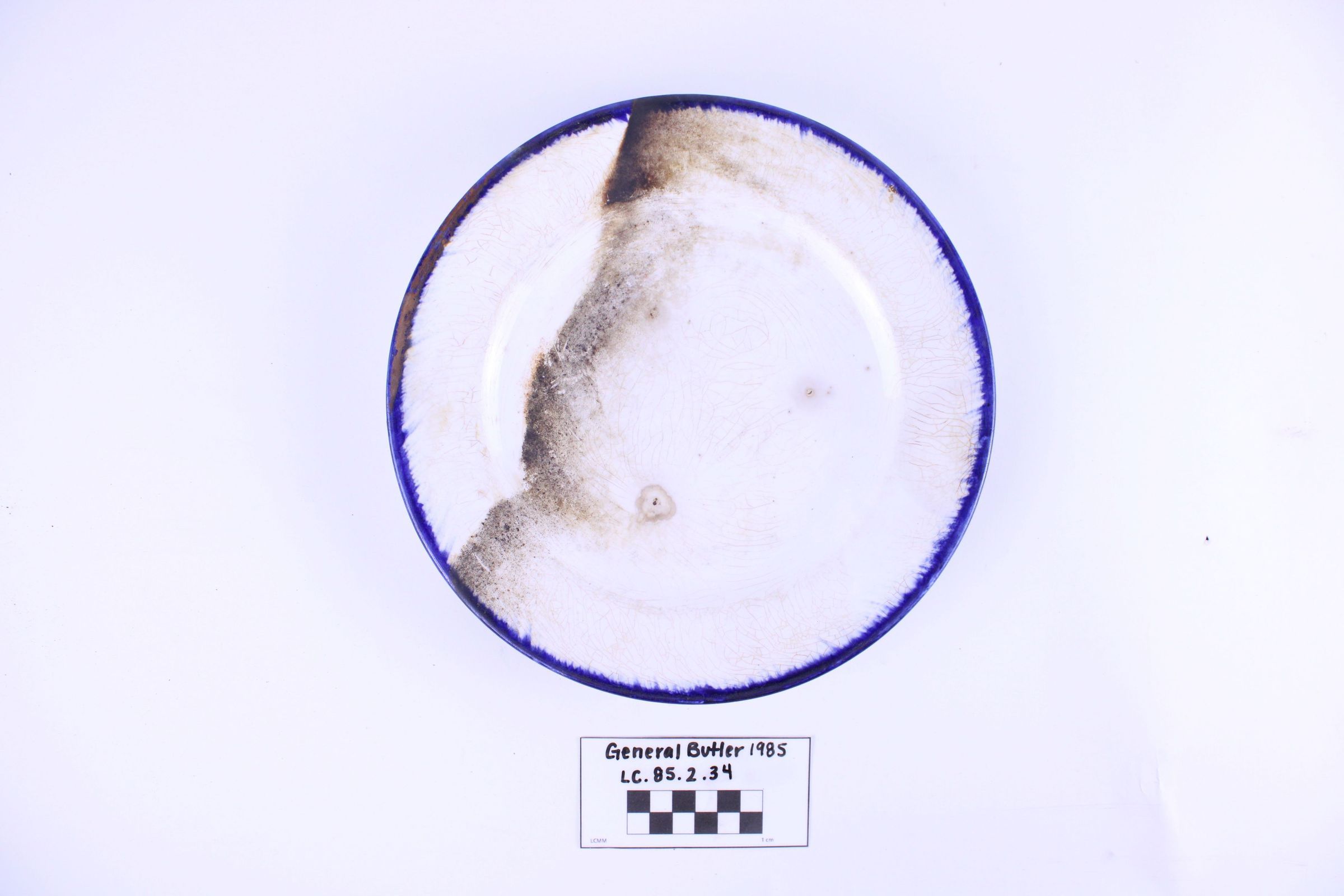 Artifact LC-85-2-34 is one (1) white ceramic plate with deep blue glaze around the rim, pulled from the General Butler. The plate has a brown band of discoloration across the face. The bottom is a white glaze with similar but less intense brown discoloration line . No makers mark is visible.