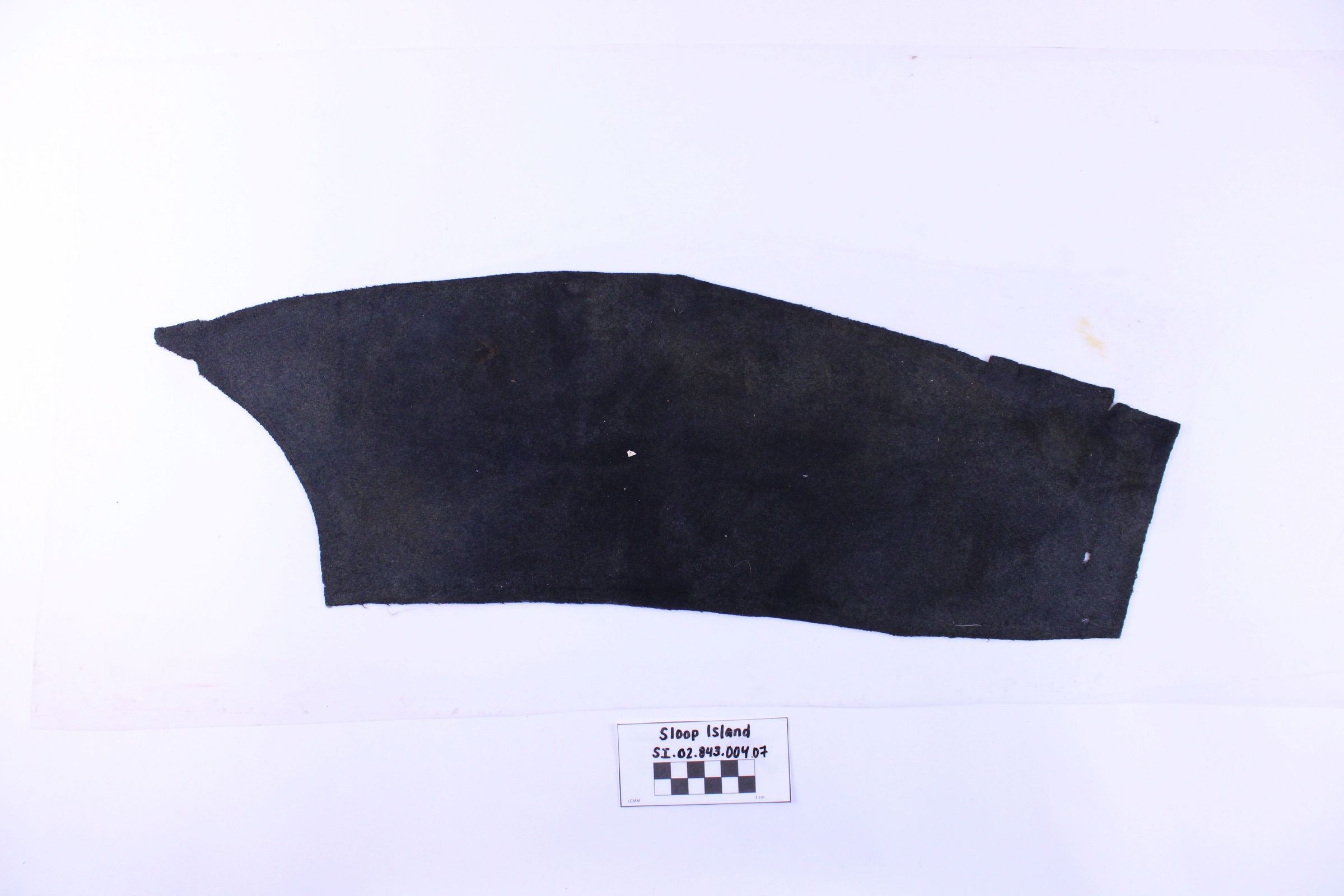 Object SI.02843.004.007 is a fragment of the inner left sleeve of a wool coat. The wool is black. There are several small holes in the material.