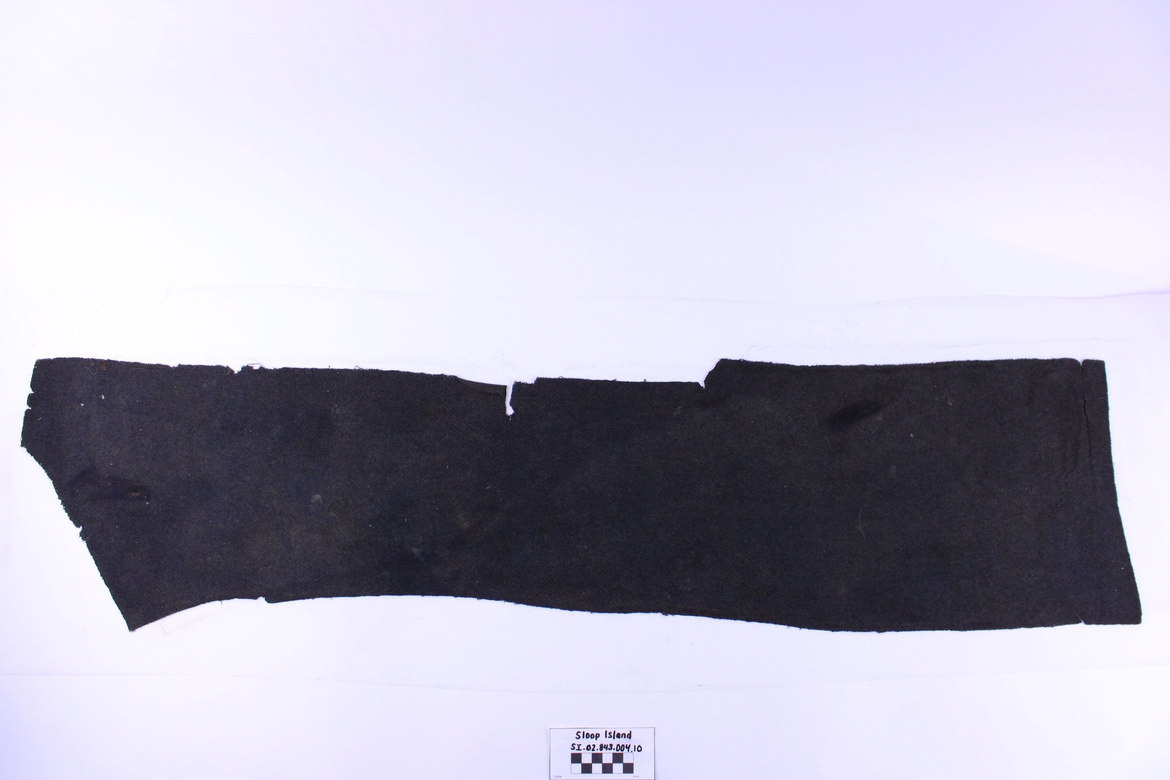 Object SI.02.843.004.010 is a fragment of the right back panel of a wool coat. The wool is black with several areas of fading to a lighter brown.Use