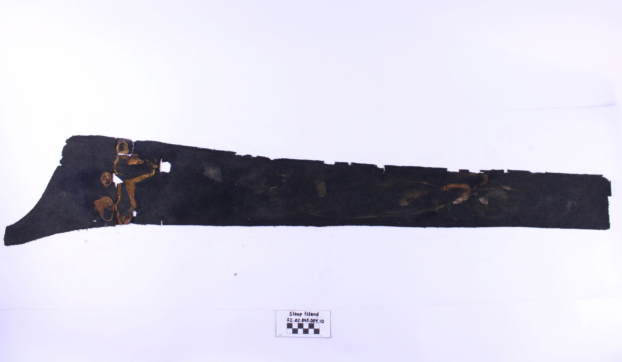 Object SI.02843.004.008 is a fragment of the right interfacing of a wool coat. The wool is black. There are several areas where rust from nearby iron objects discolored the fabric.Use