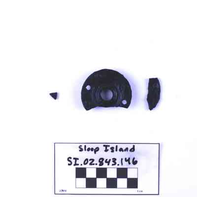Object SI.02.843.146 is a lot of three (3) fragments of cast iron doorknob hardware. There are three (3) holes drilled into the main fragment.