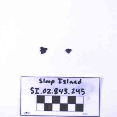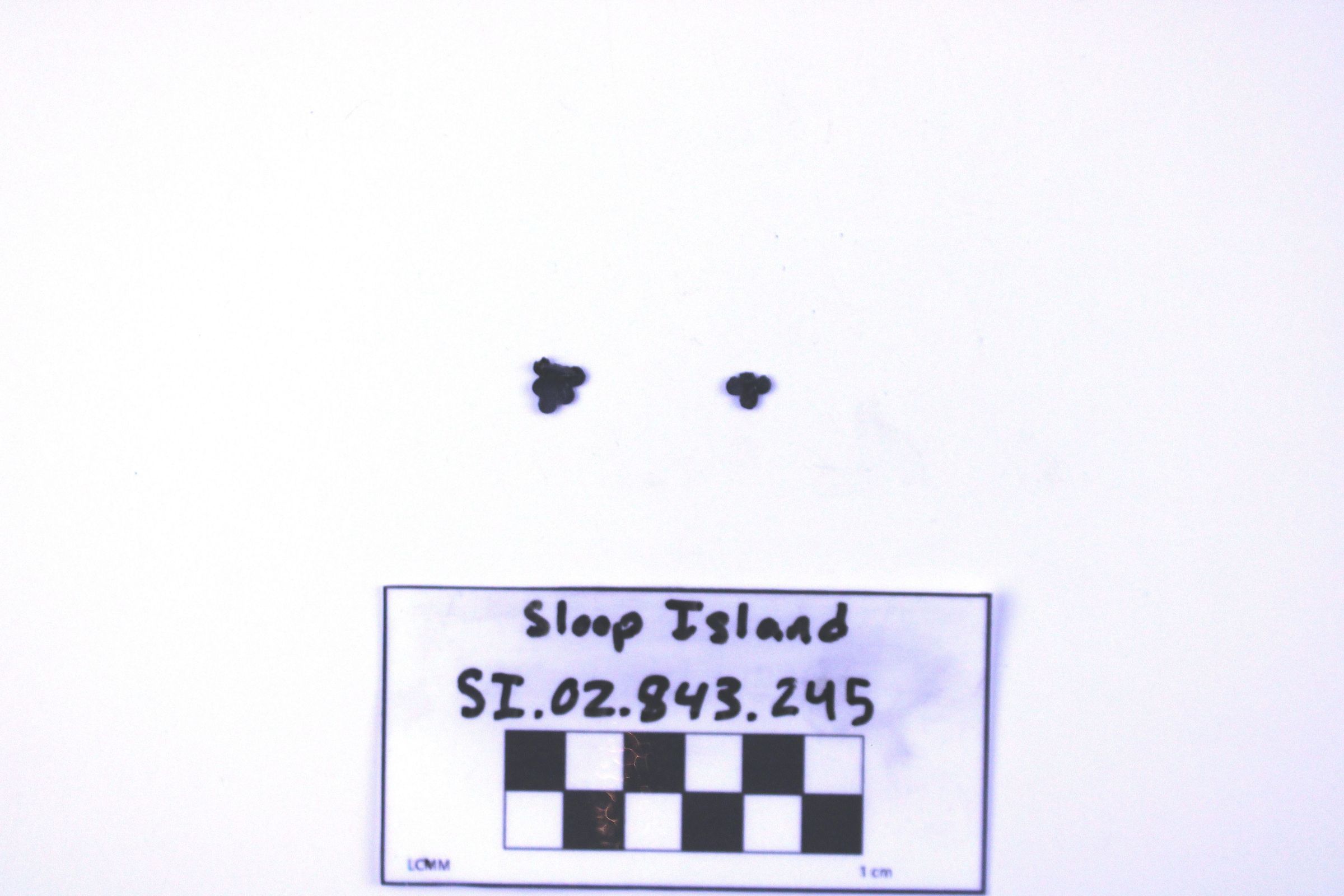 Object SI.02.843.245 is a lot of two (2) fragments of a small brass ornament. It is made up of small brass circles surrounding a larger diamond shape in the center.Collection