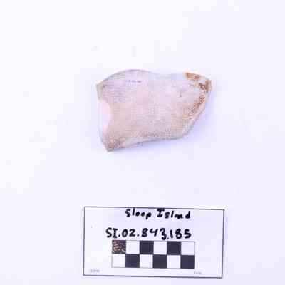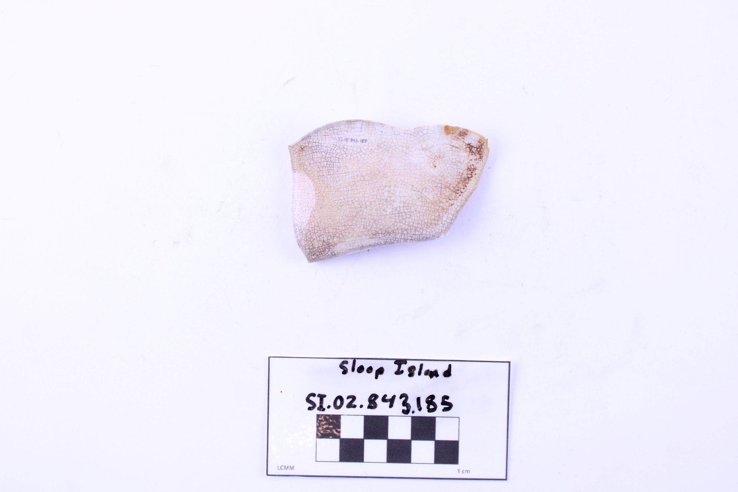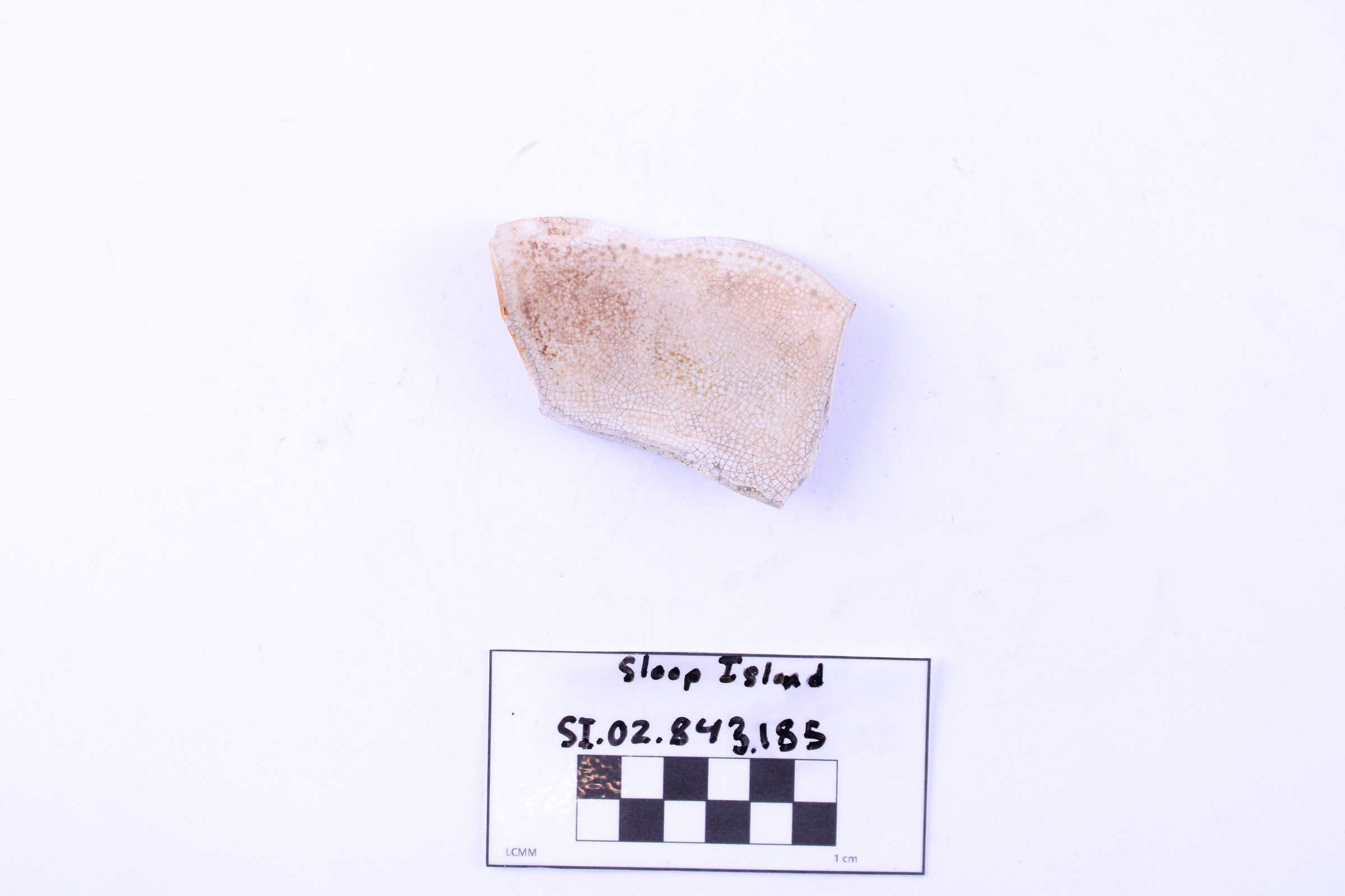 Object SI.02.843.185 is a fragment of a whiteware plate. The glaze has many small cracks, giving the surface a deep red tone. The rim has a scalloped edge with a faint beading design following the edge of the rim.