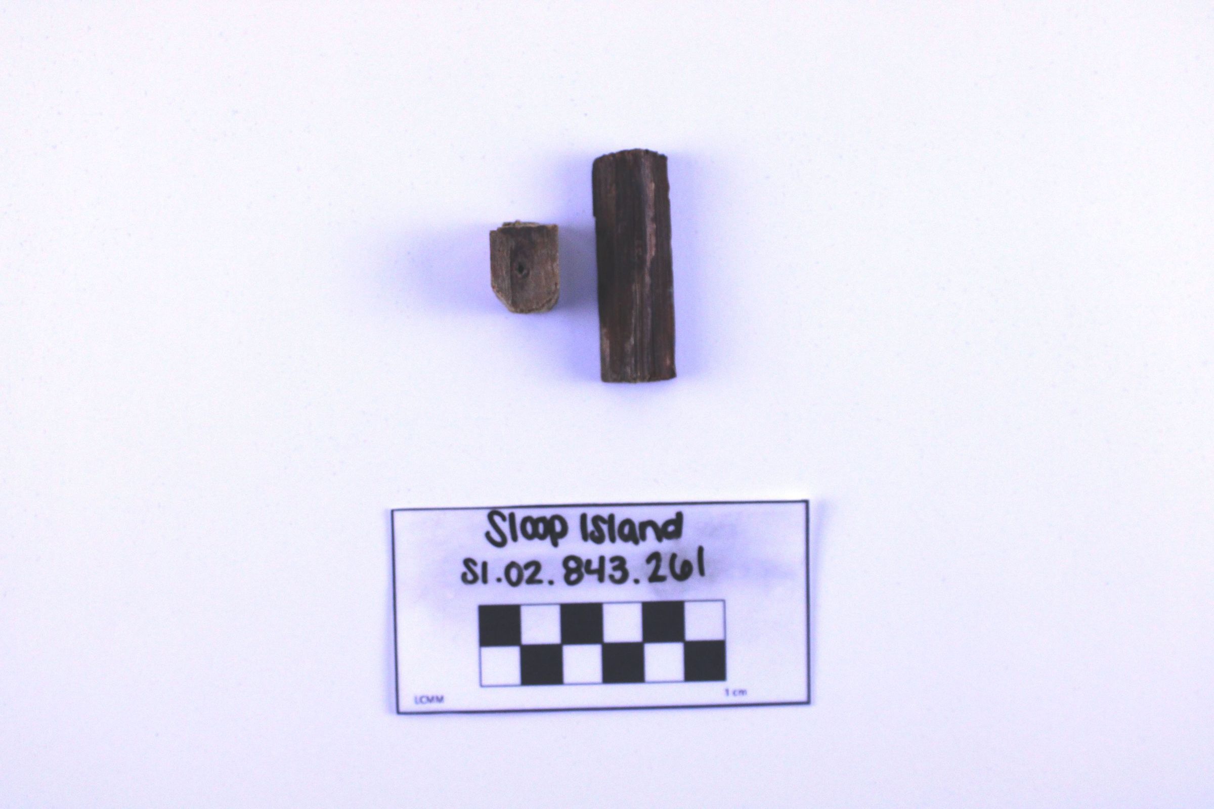 Object SI.02.843.261 is a lot of two (2) small wooden fragments. The smaller of the two (2) has a hole drilled into its center.Use