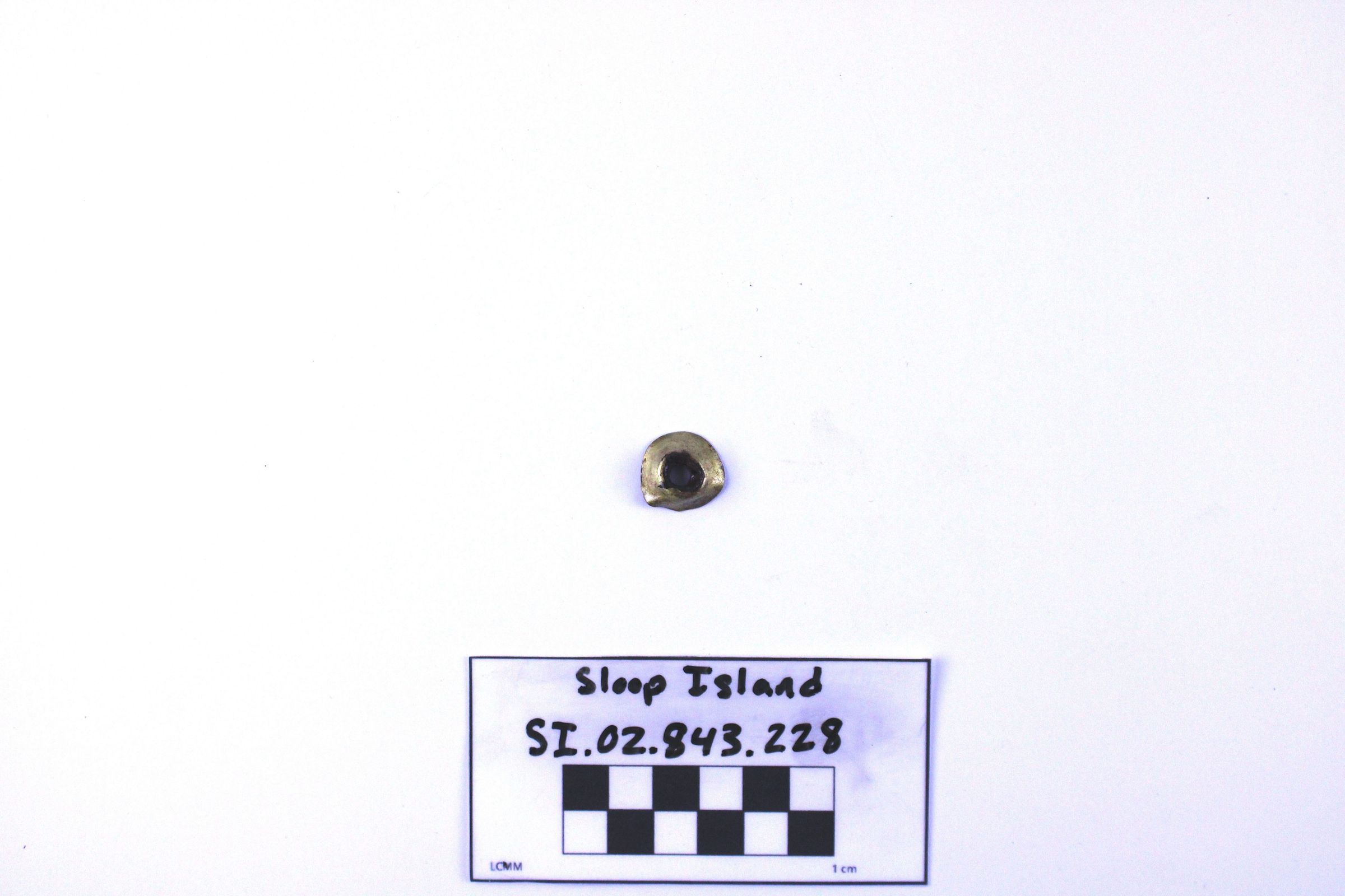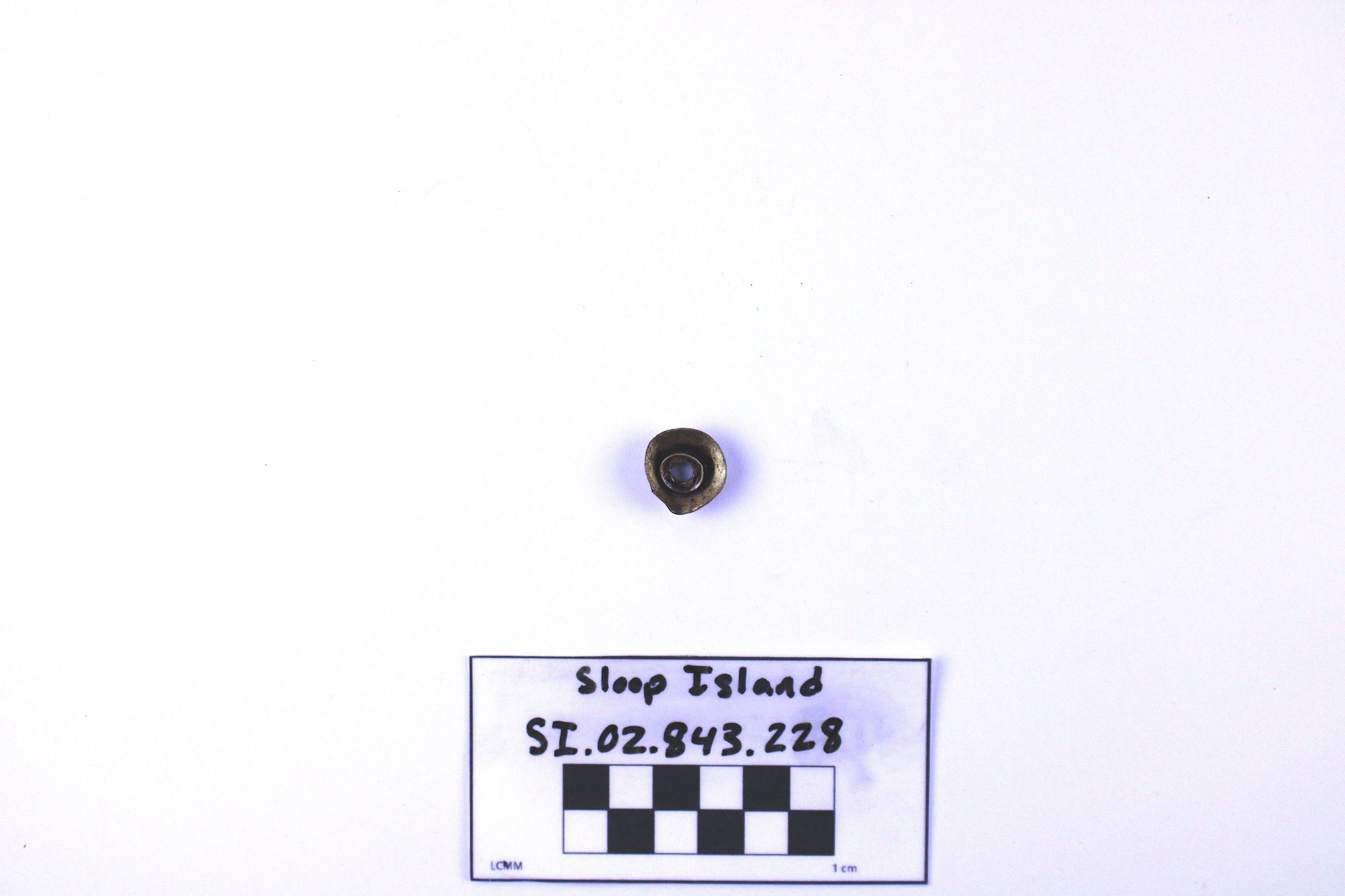 Object SI.02.843.228 is a brass flange for a hook. It has been bent significantly on one side.