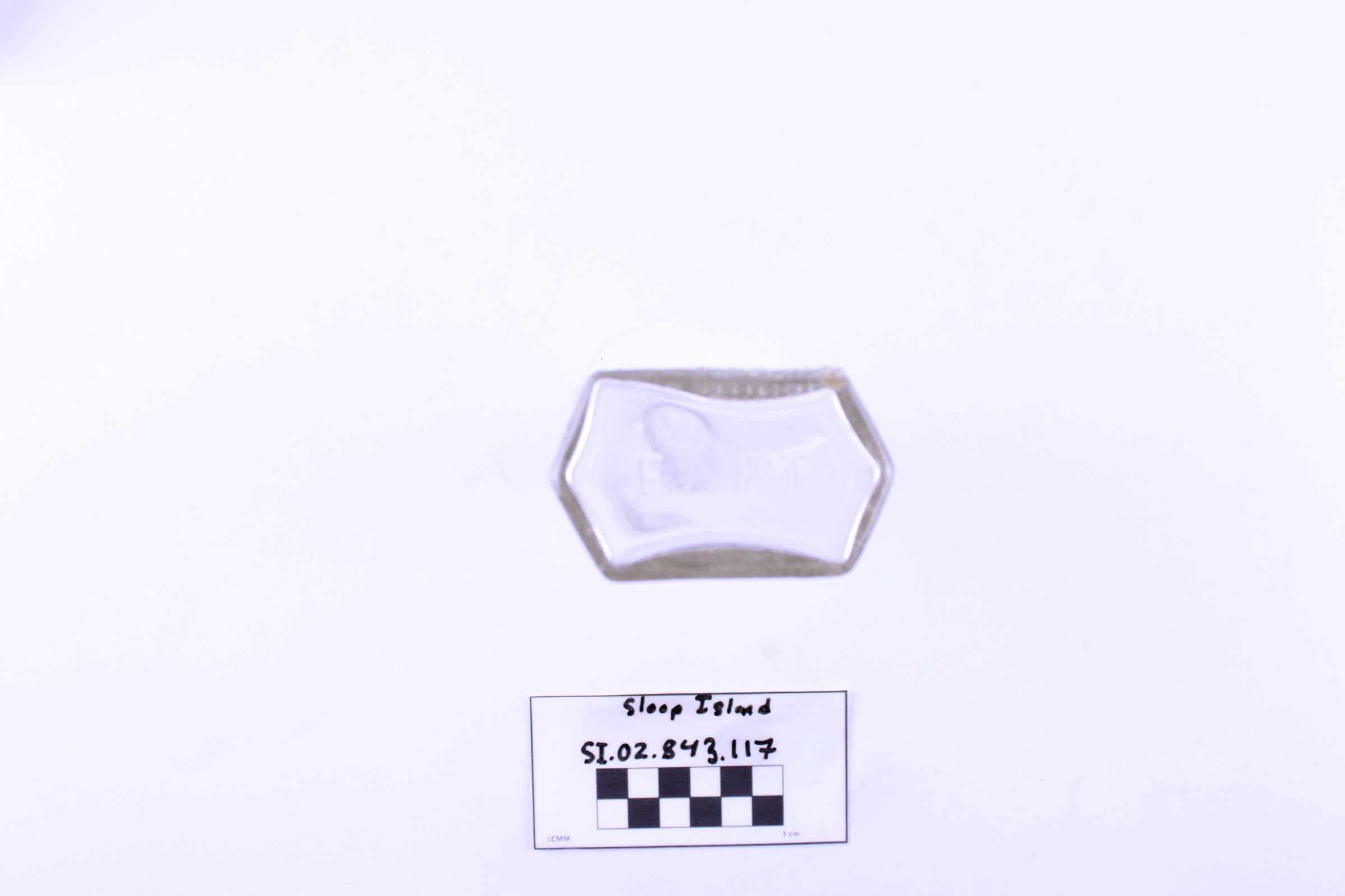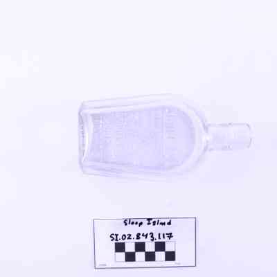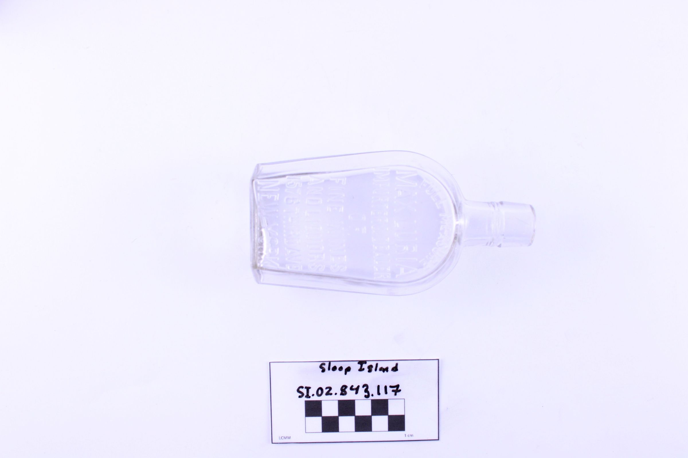 Object SI.02.843.117 is a glass liquor bottle. "Full Measure Max Luria Importer & Dealer of Fine Wines and Liquors 1576 Third Ave New York" has been stamped into one side. "F. 1/2 PT. 1" has been stamped into the base. There are several small scratches in the neck of the bottle.