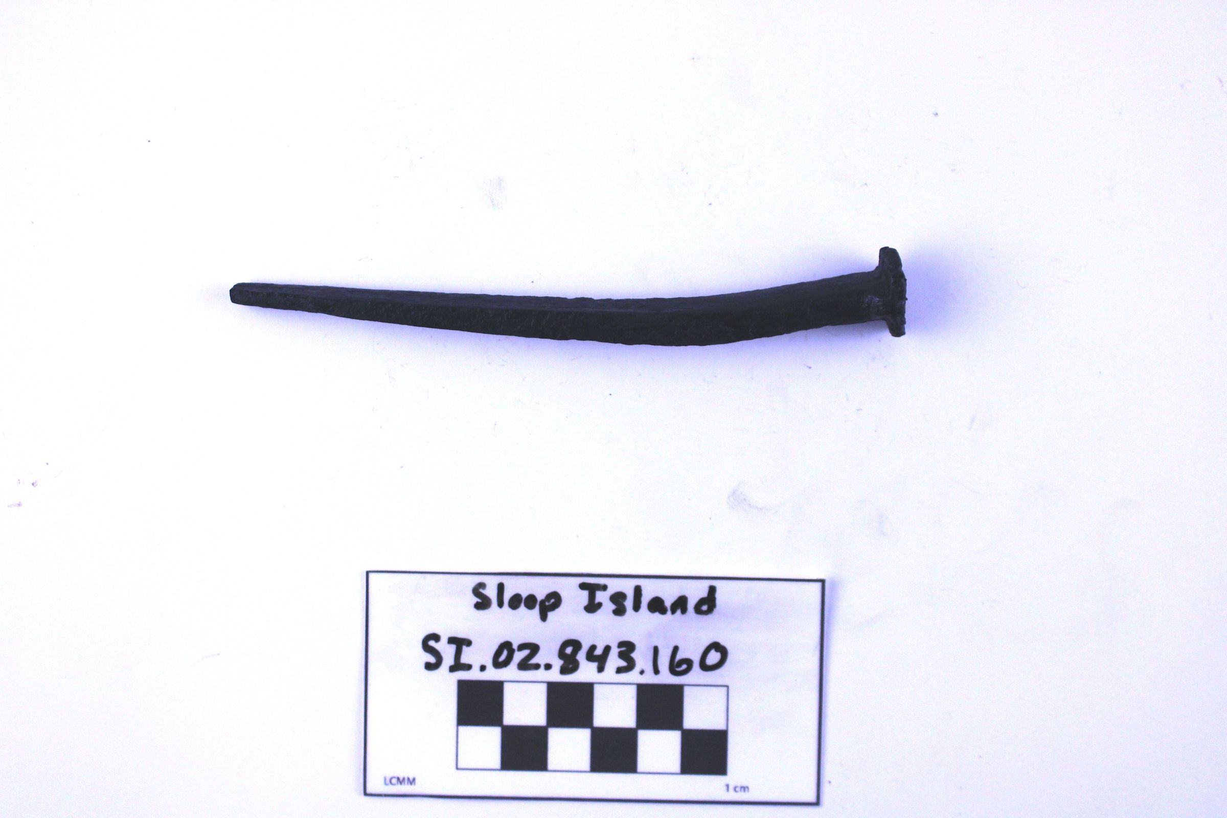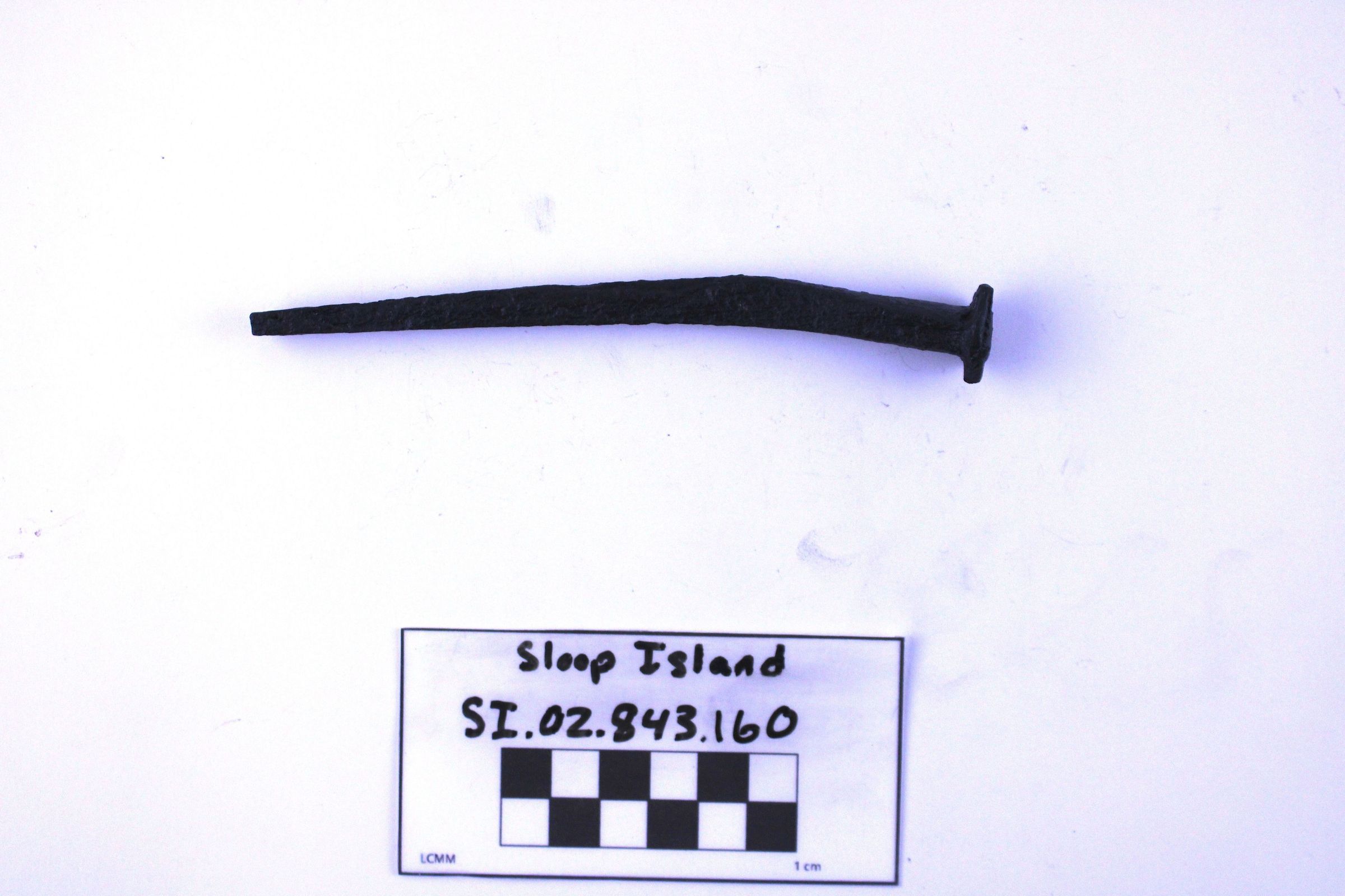 Object SI.02.843.160 is an iron nail with a square head. There is a slight bend in the body of the nail.