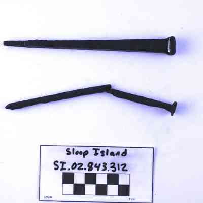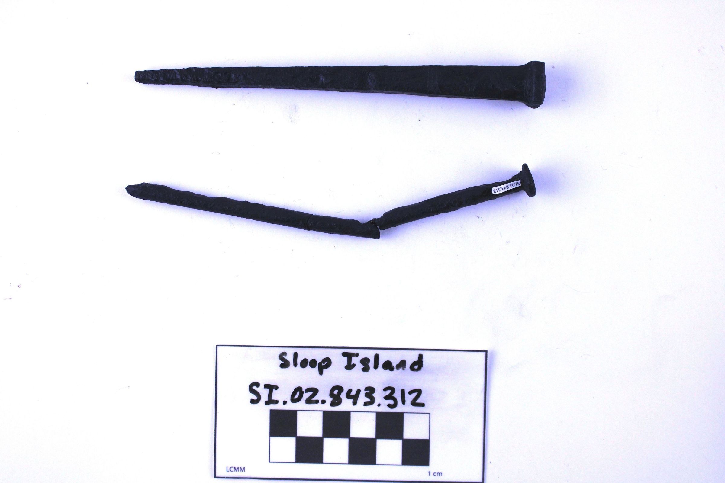 Object SI.02.843.312 is a lot of two (2) large nails. One (1) has a square head. The other has a round head and has nearly broken in half.