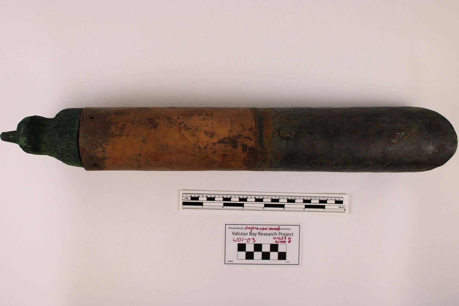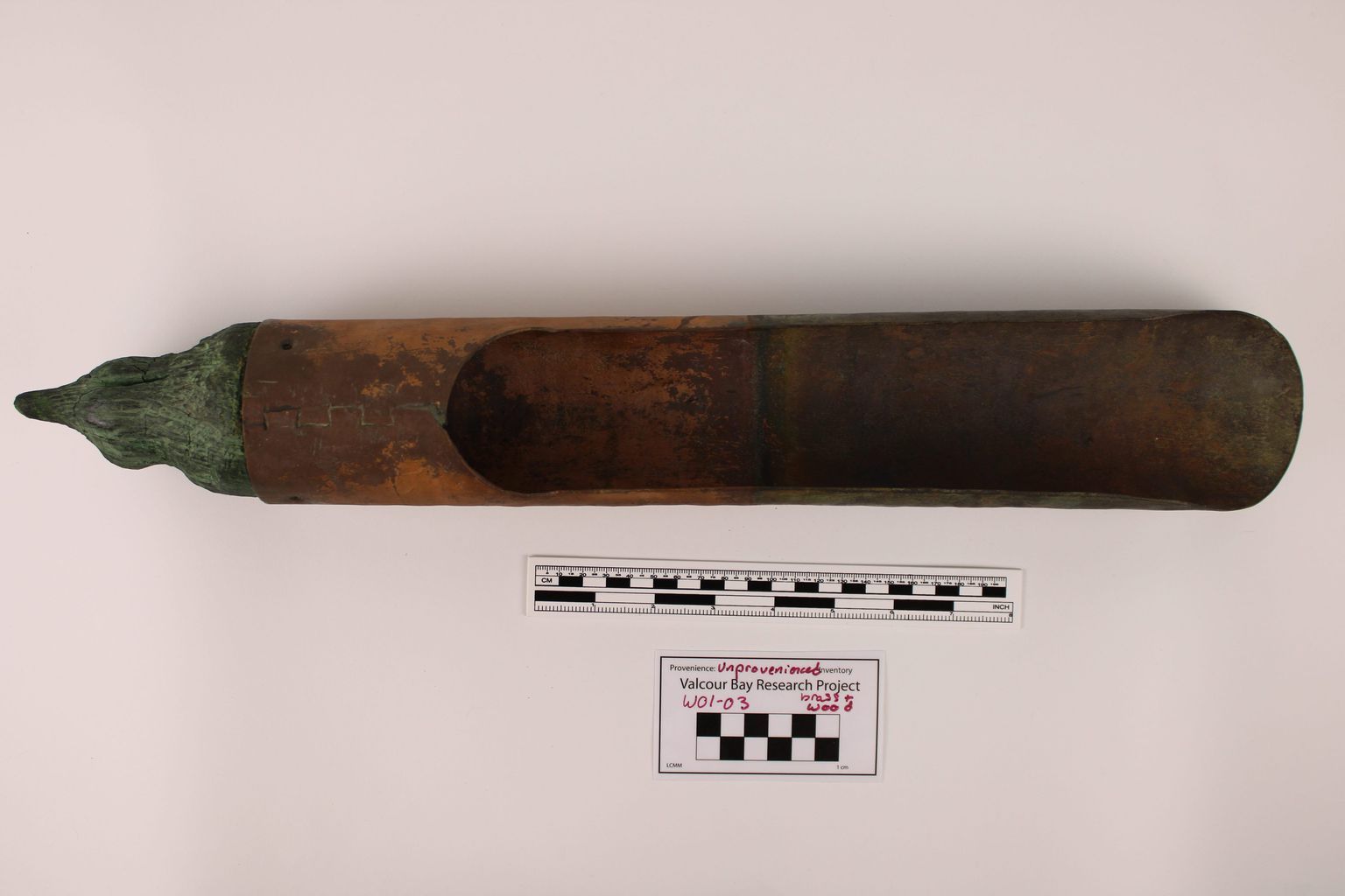 Artifact W01-03 is a brass powder charge scoop with a wooden handle.Use