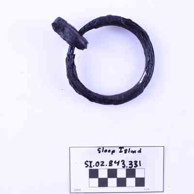 Object SI.03.843.331 is an iron ring bolt. The head of the bolt is still attached to the ring, though the rest of the bolt is missing.