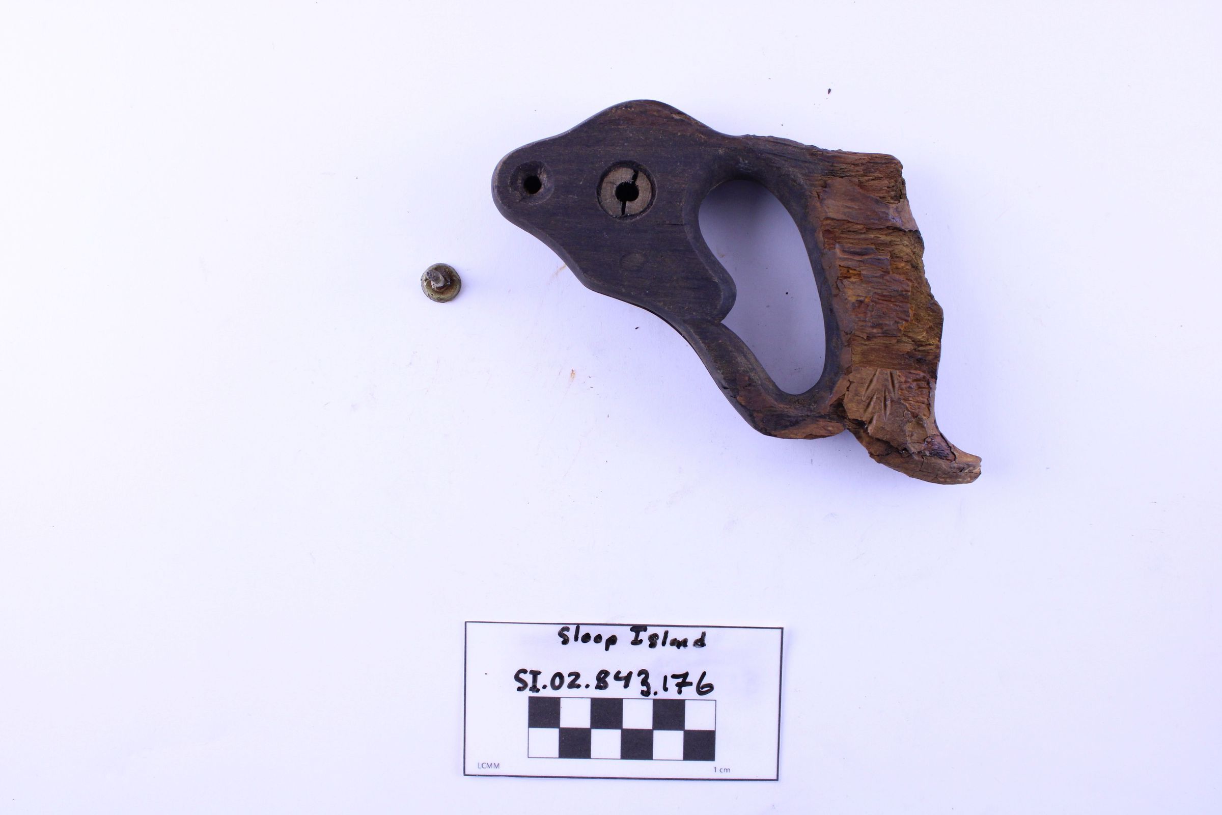 Object SI.02.843.176 is a saw handle and screw. The wood has been carved and sanded to fit the hand of the user more comfortably. The accompanying screw is slightly bent.