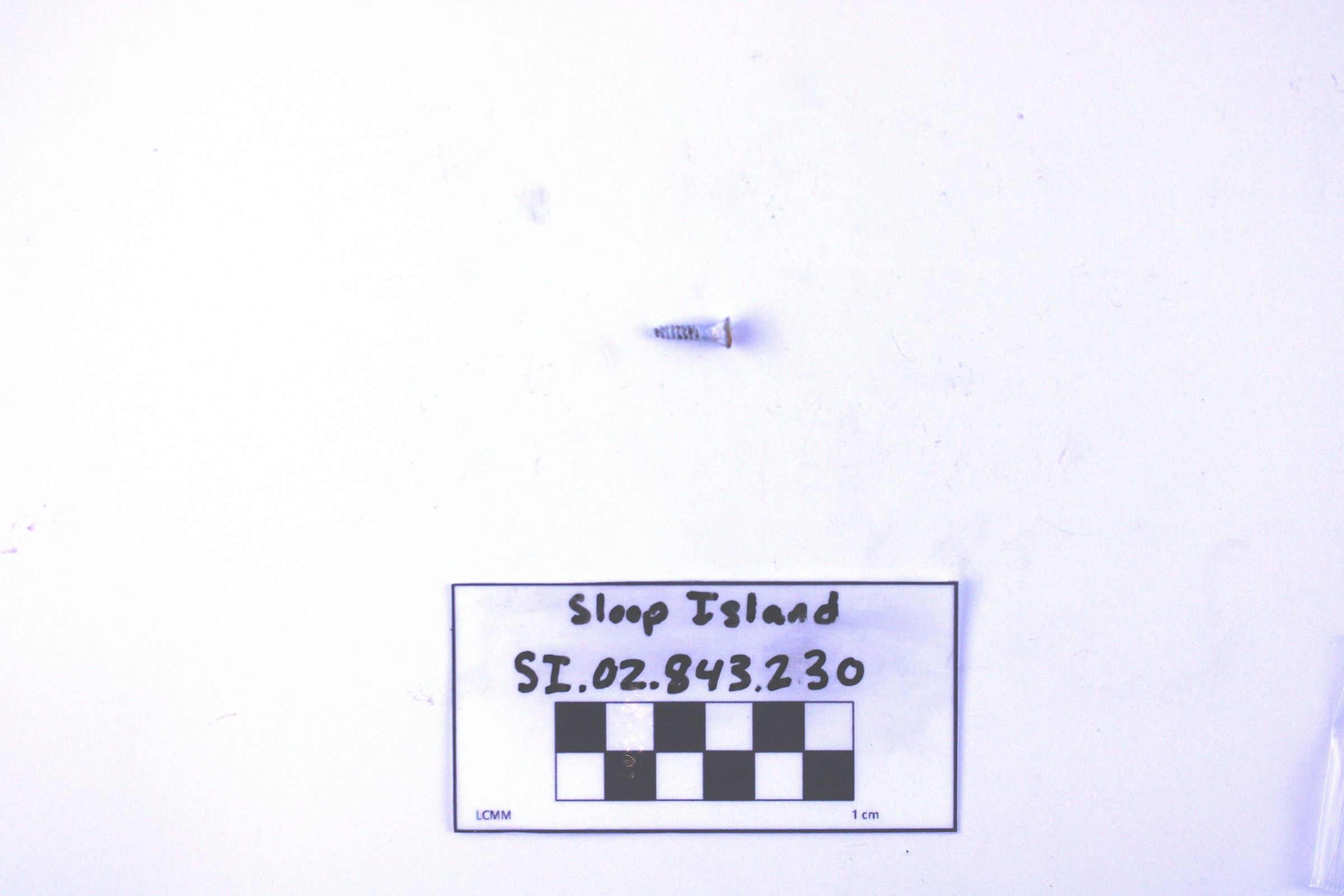 Object SI.02.843.230 is an iron screw. The coloration is significantly different from other iron screws and fasteners in this collection. It is painted white with an oxidized orange patch on the top of the head.