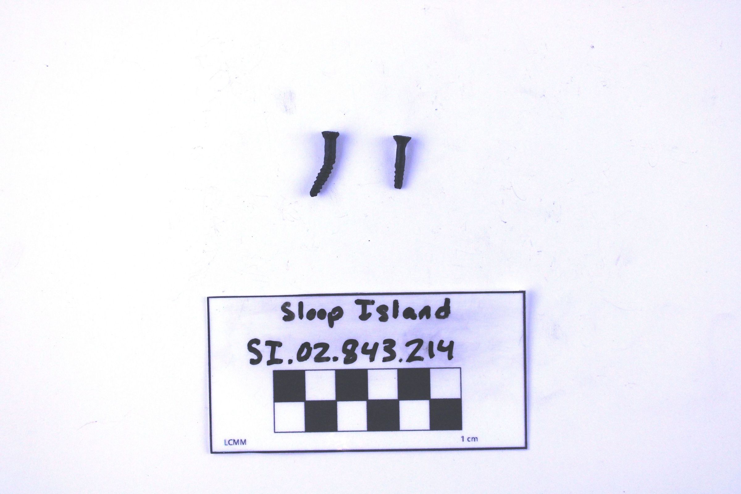 Object SI.02.843.214 is a lot of two (2) iron screws. The larger of the screws has been bent.