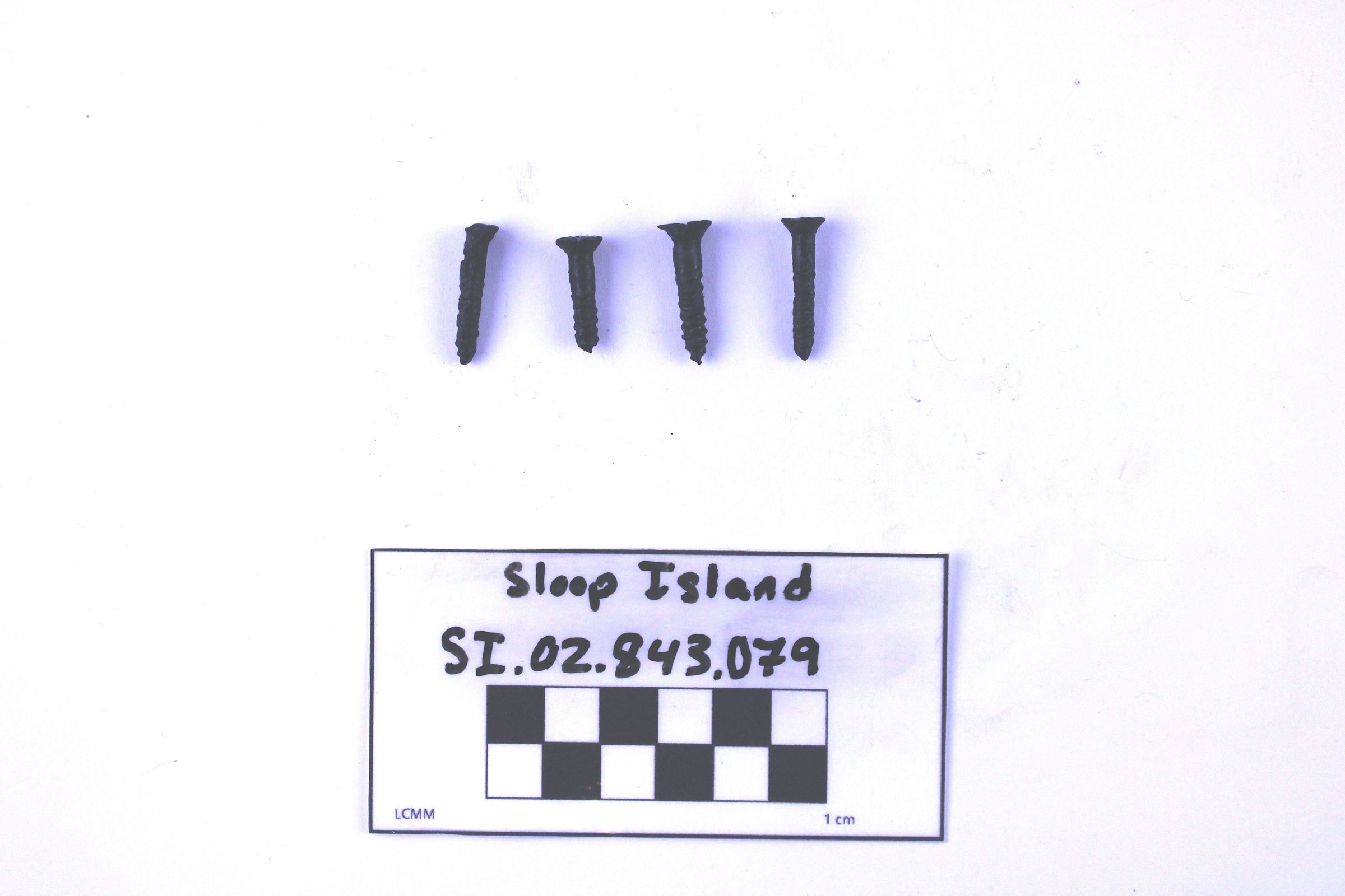 Object SI.02.843.079 is a lot of four (4) iron screws. One (1) of the screws has broken down the middle.