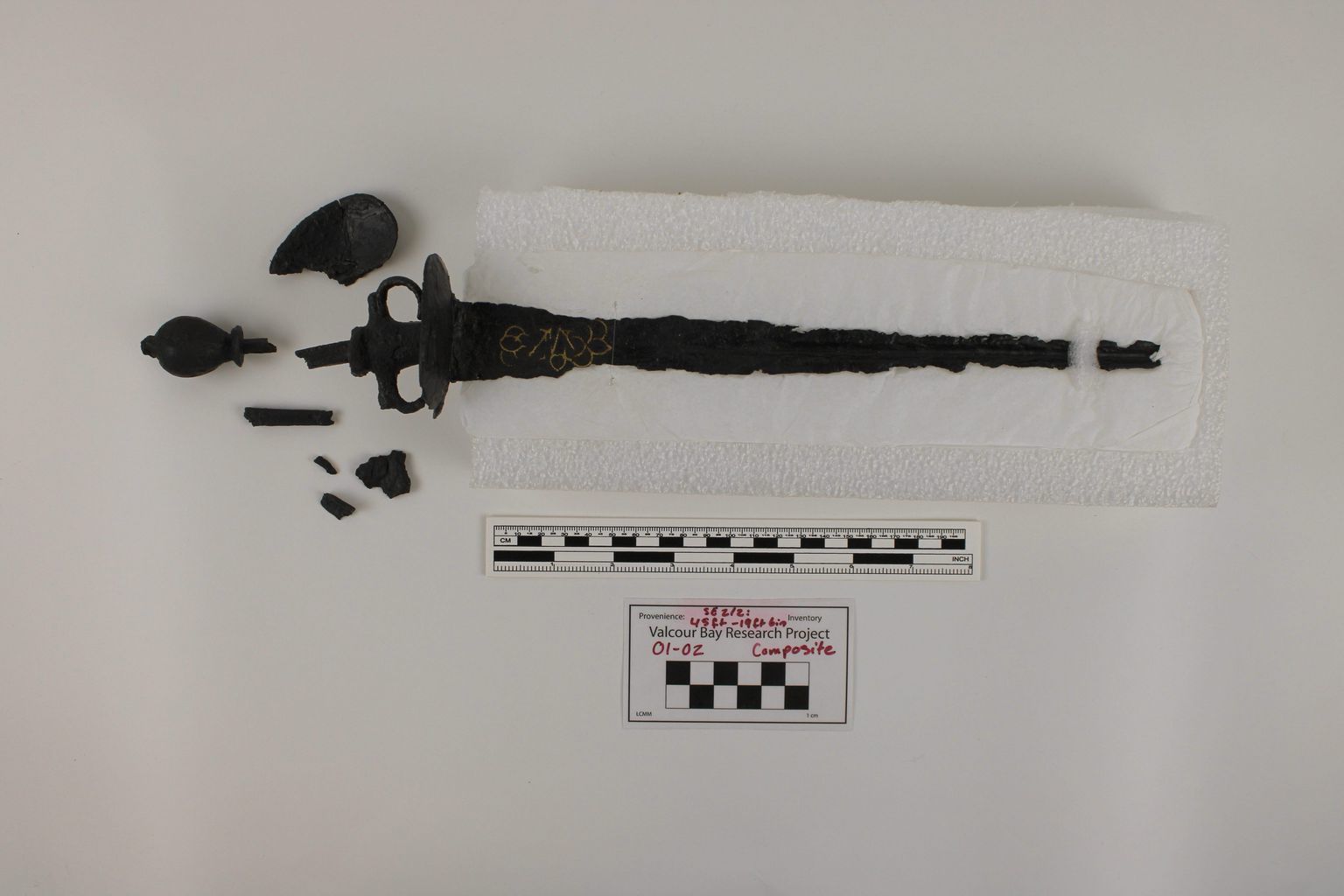 Artifact 01-02 is a portion of a sword, including the pommel, hand guard, a segment of the blade, and part of the scabbard and the frog. This artifact has a decidedly shoddy appearance and may be representative of the fact that many American soldiers were armed with whatever weapons could be gathered despite their condition.Collection