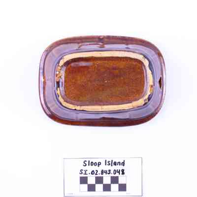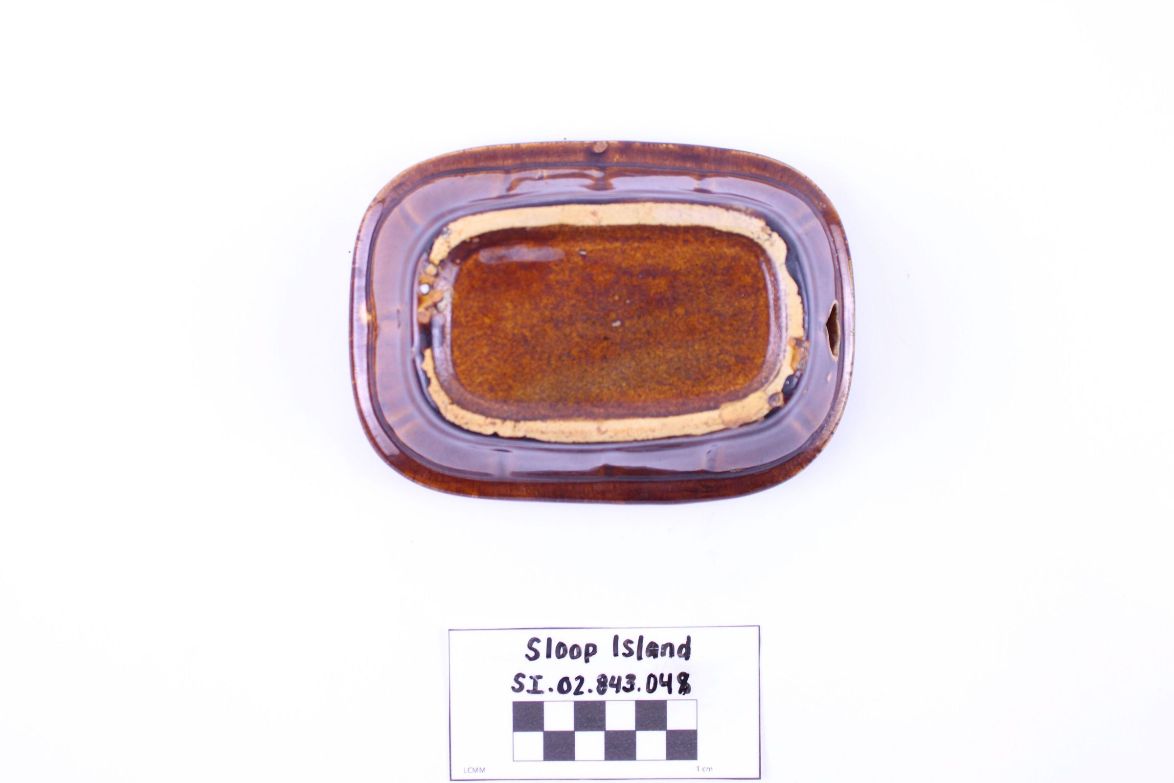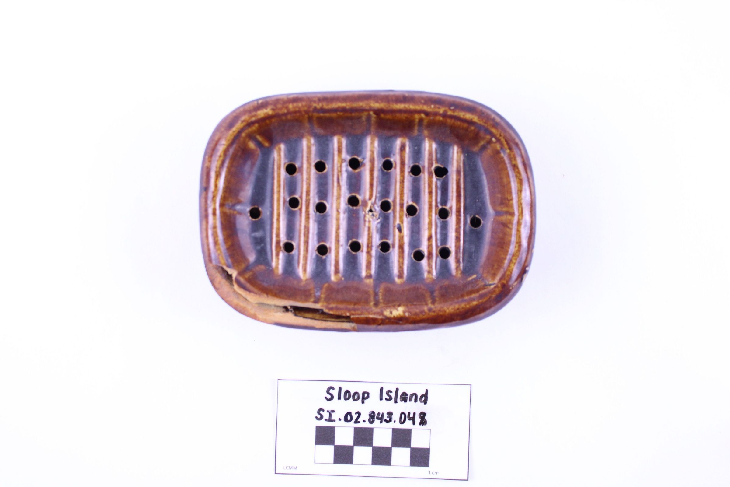 Object SI.02.843.048 is a ceramic soap dish. The soap tray has twenty (20) drainage holes in its surface. These holes drain into a container beneath. There is a larger hole in one side to pour out excess water.
