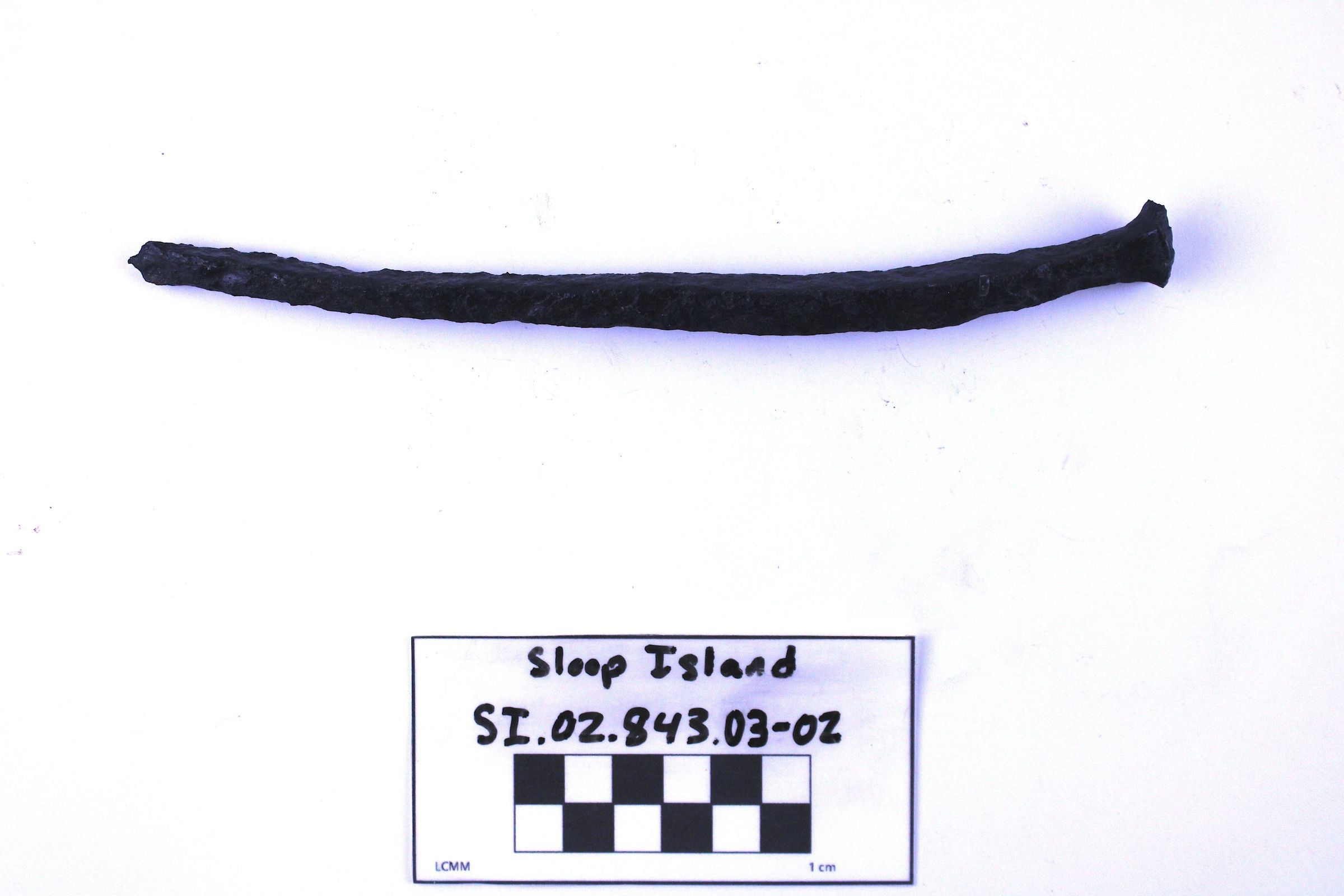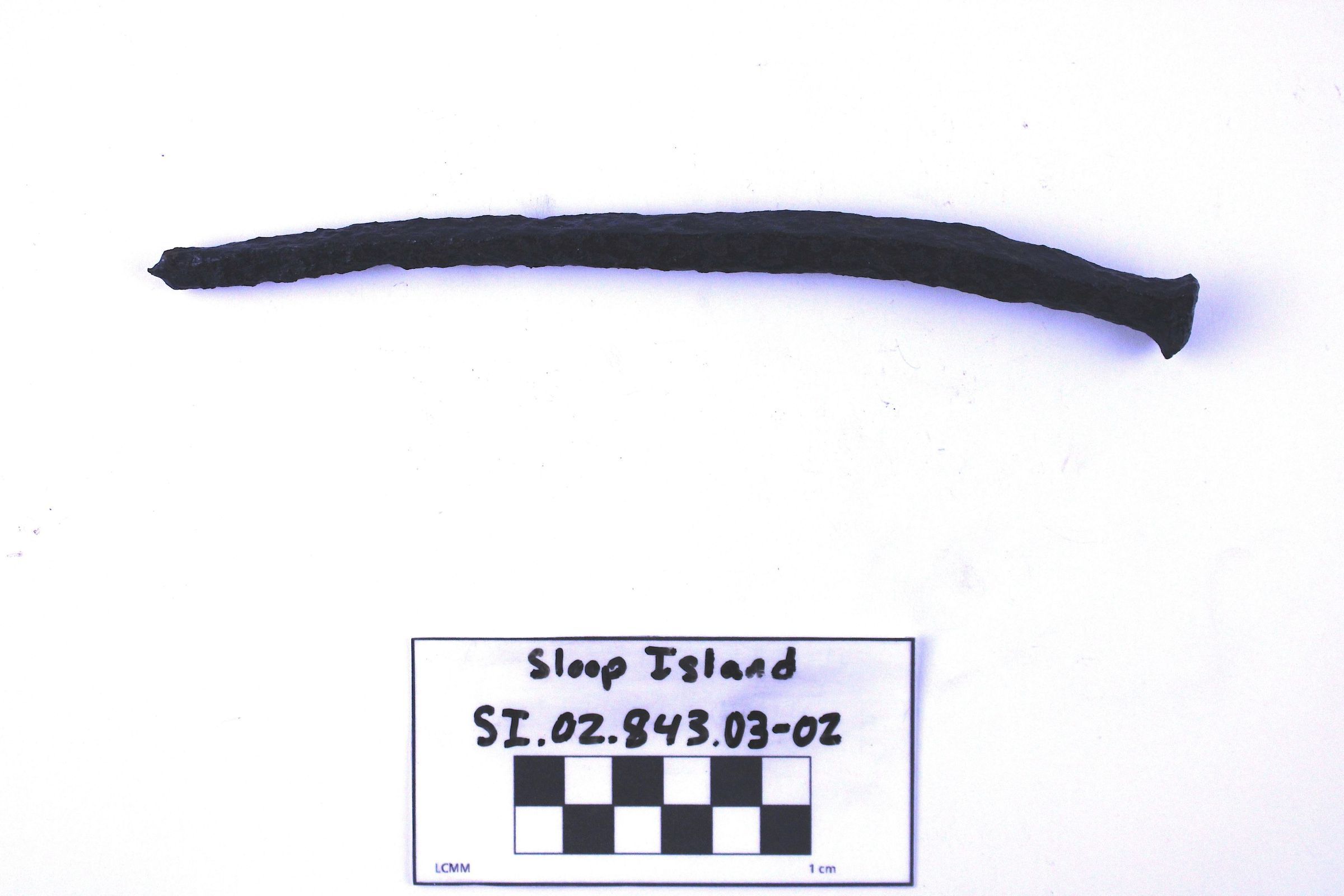 Object SI.02.843.03-02 is a large iron spike. There is a slight curve in the body of the spike.
