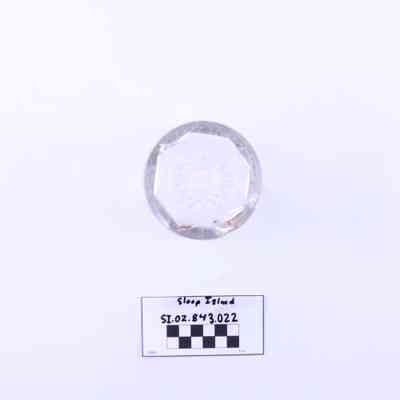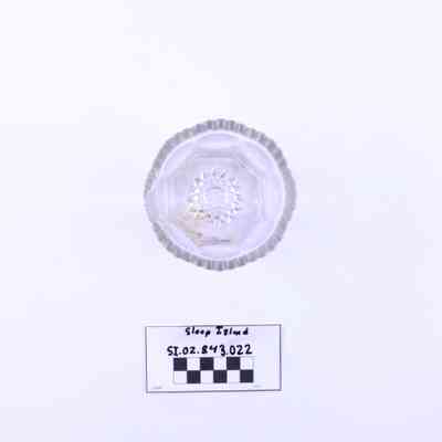 Object SI.02.843.022 is a glass spoon holder. The rim has a scalloped edge, and the base has a geometric design carved into it. There are several cracks in the base, including one that extends across one side.Collection