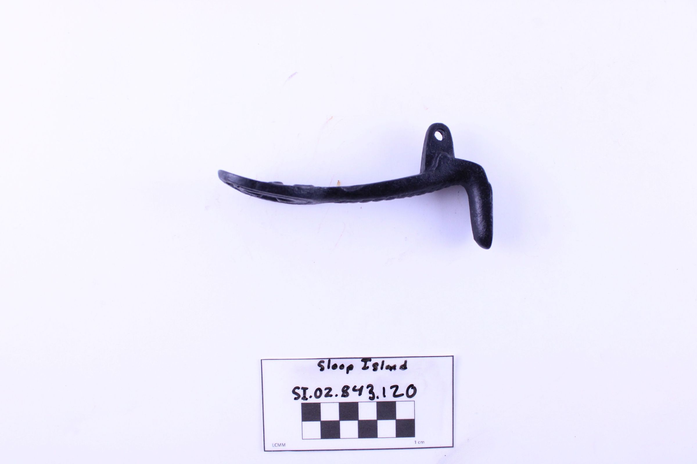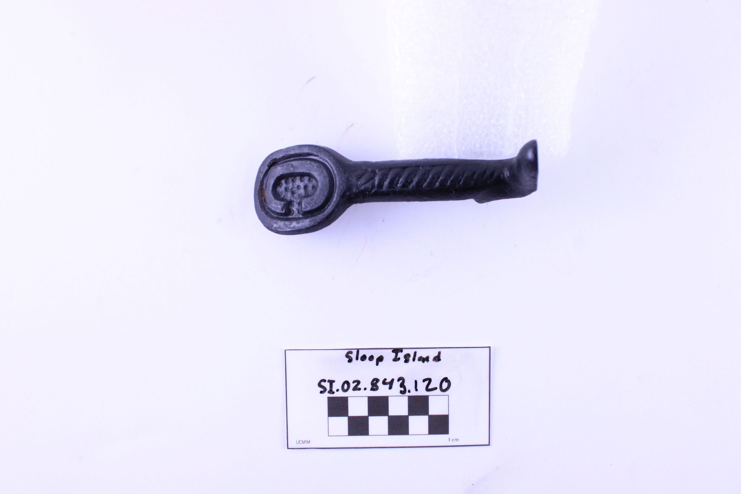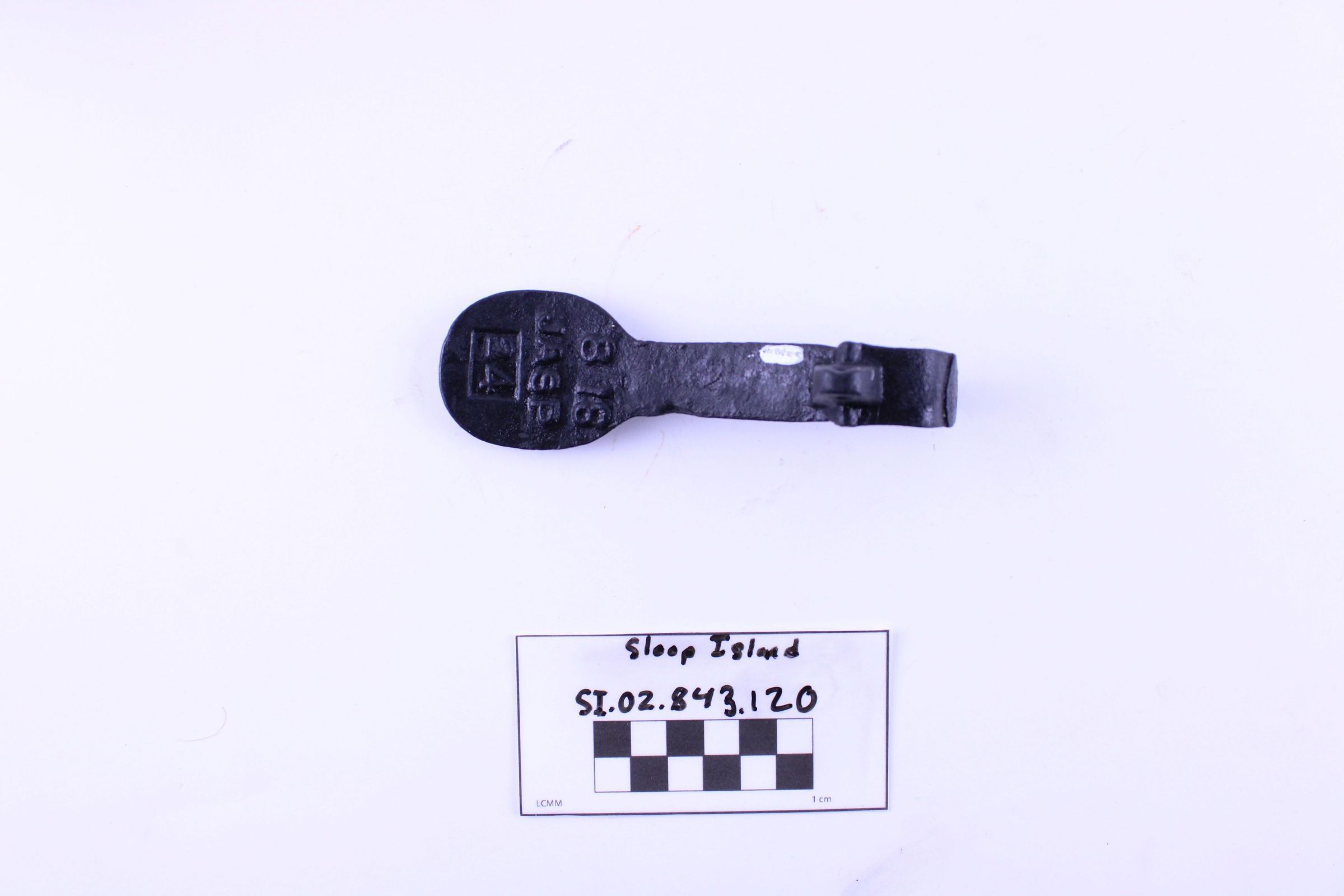 Object SI.02.843.120 is an iron stove handle. On the top, there is a "C" stamped into the surface. The bottom has "8 18 JASP 24" stamped into the surface.