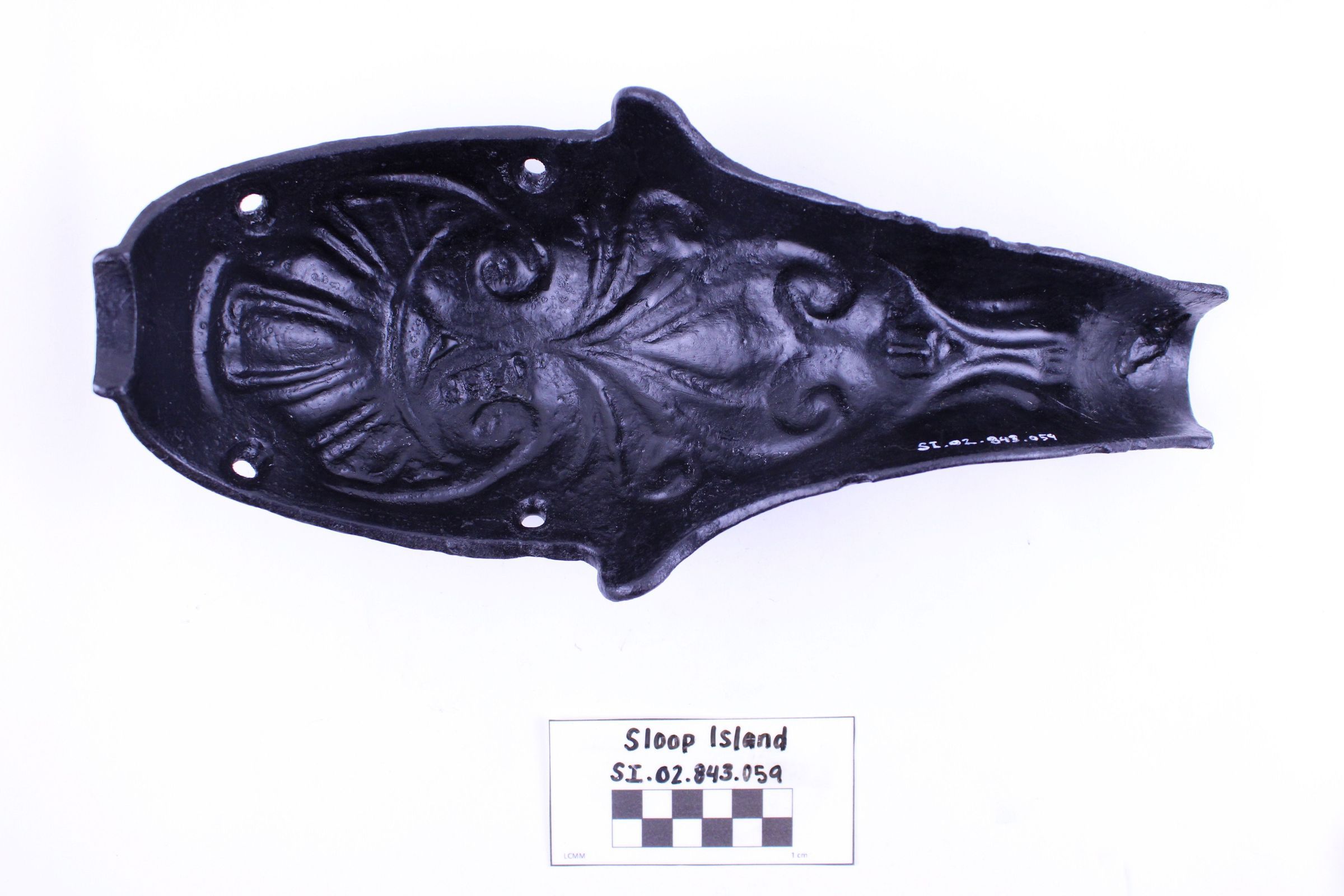 Object SI.02.843.059 is an iron stove leg. It is covered in an a decorative abstract design.