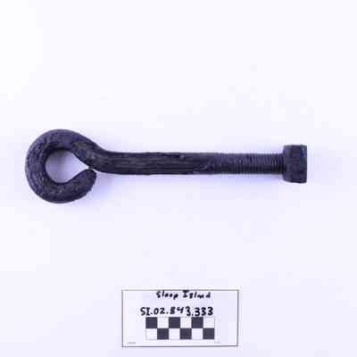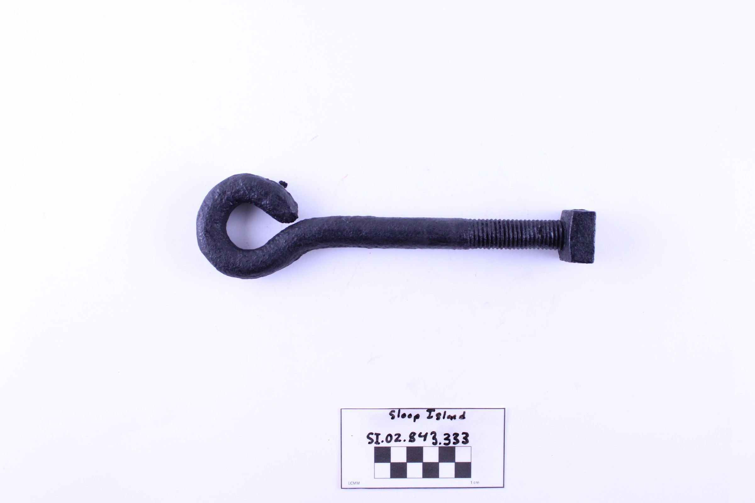 Object SI.03.843.333 is an iron threaded bolt. The nut is still on the bottom of the bolt. The top of a bolt ends in a hook.