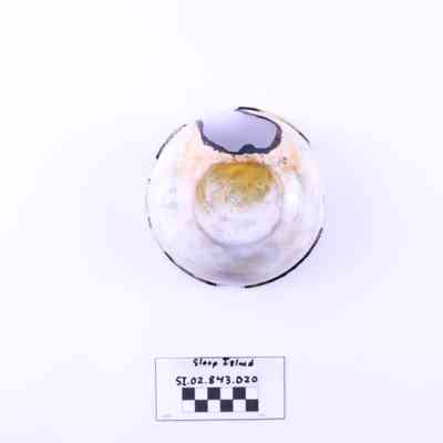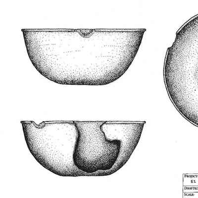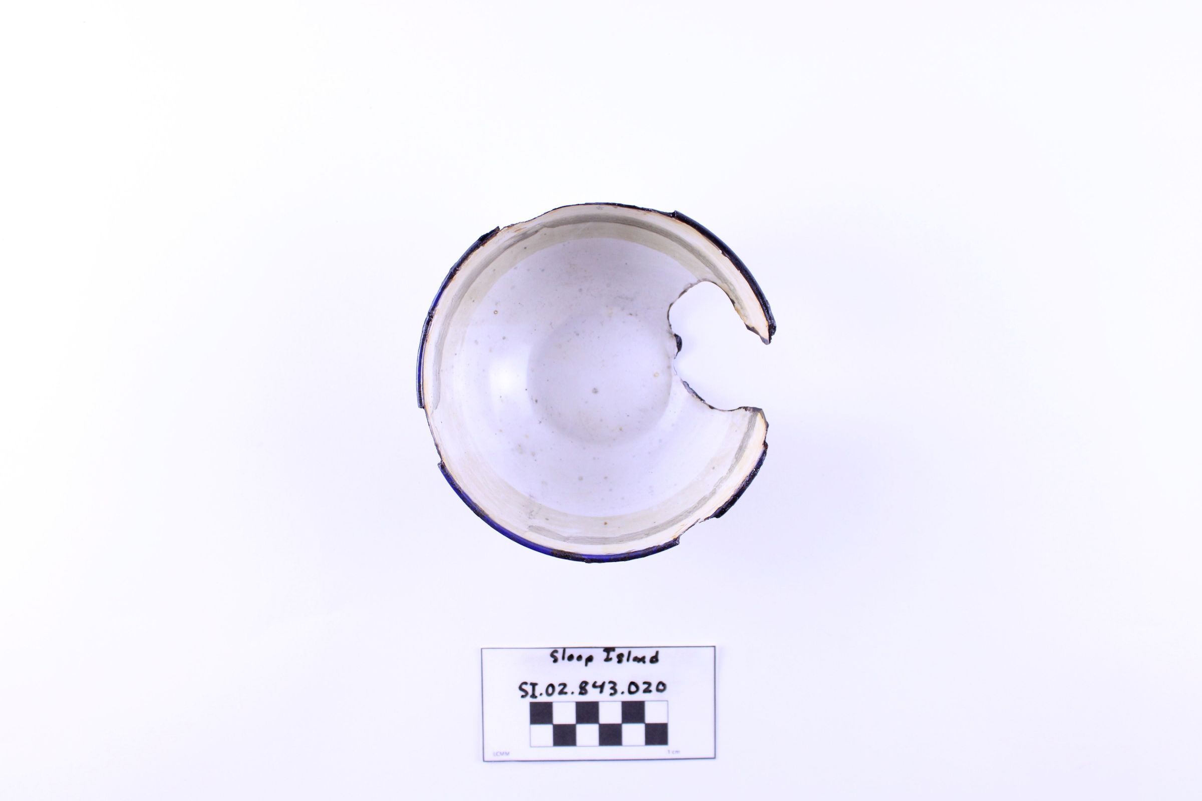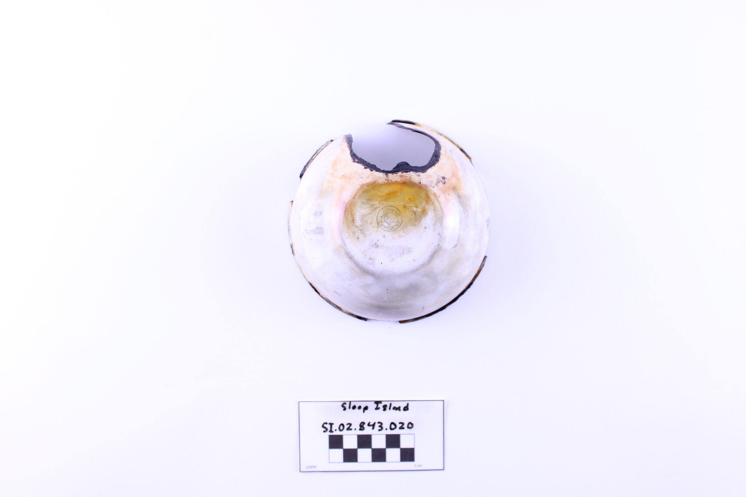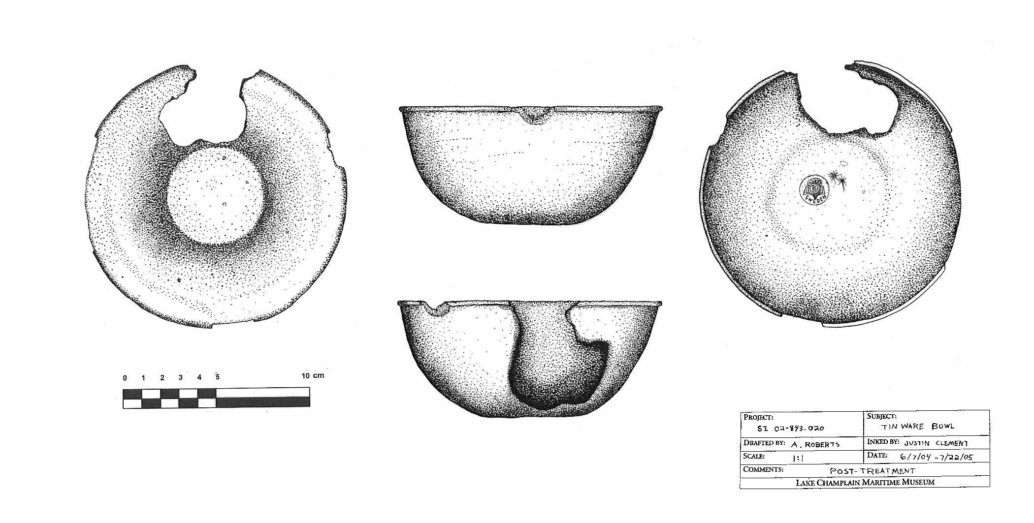 Object SI.02.843.020 is a tinware bowl; there is a small bag of SI.02.843.020 fragments nestled with the object.