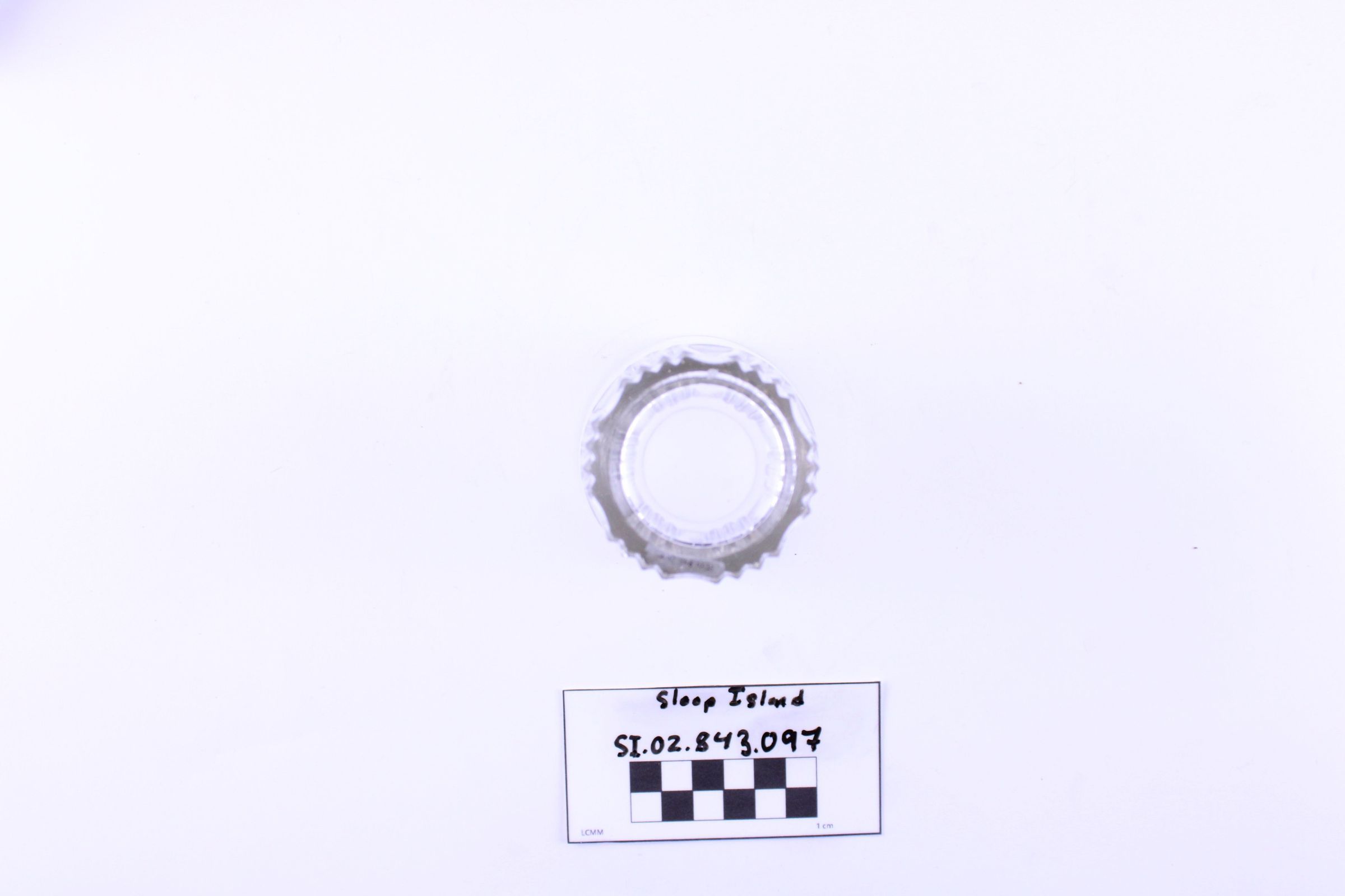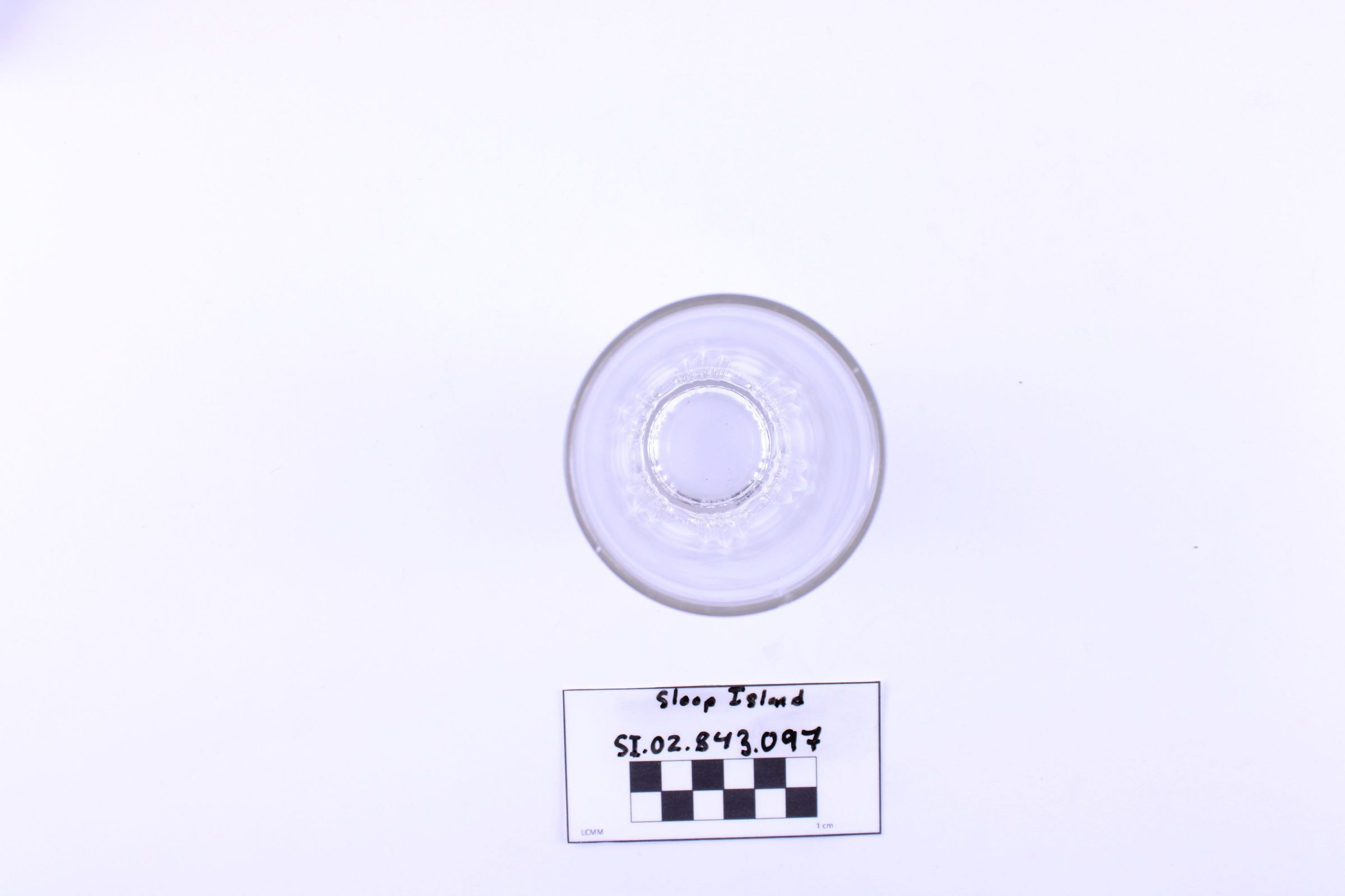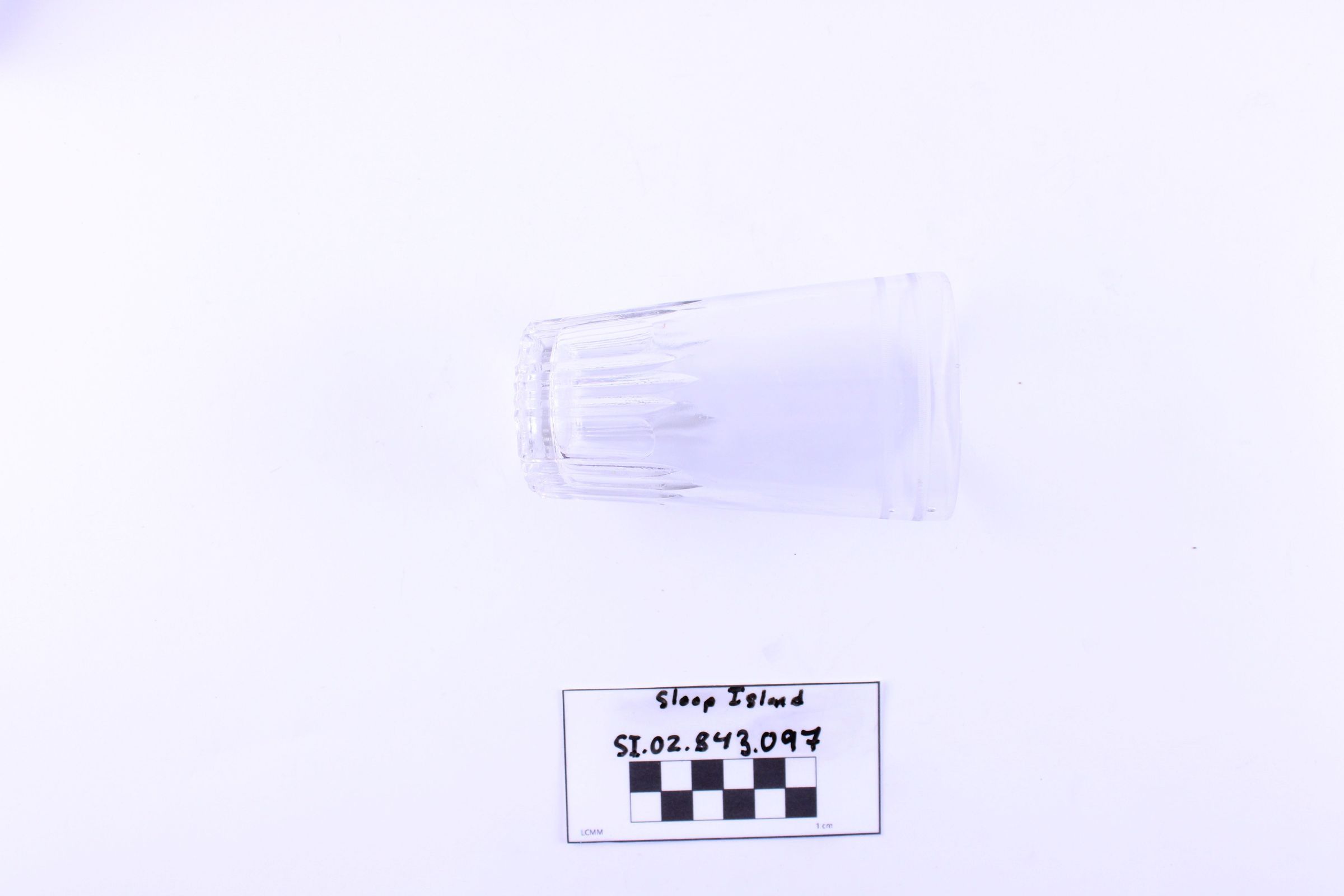 Object SI.02.843.097 is a glass tumbler. There are three decorative rings carved into its surface.