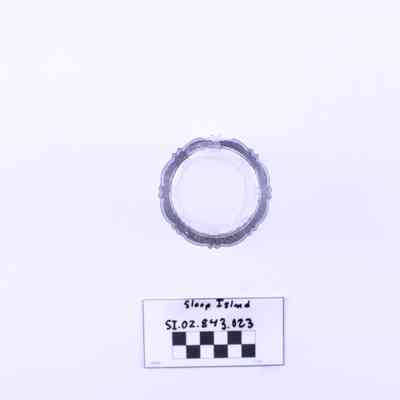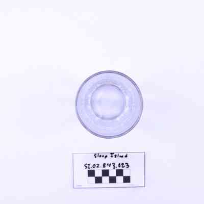 Object SI.02.843.023 is a small glass tumbler. It has three decorative rings around its surface.