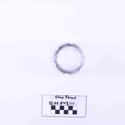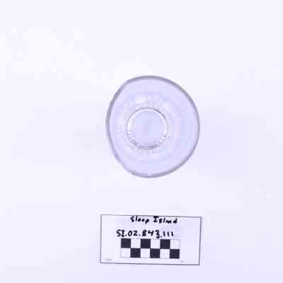 Object SI.02.843.111 is a glass tumbler. It has three decorative rings carved into its surface. A large section of the glass has broken off around the rim of the object.