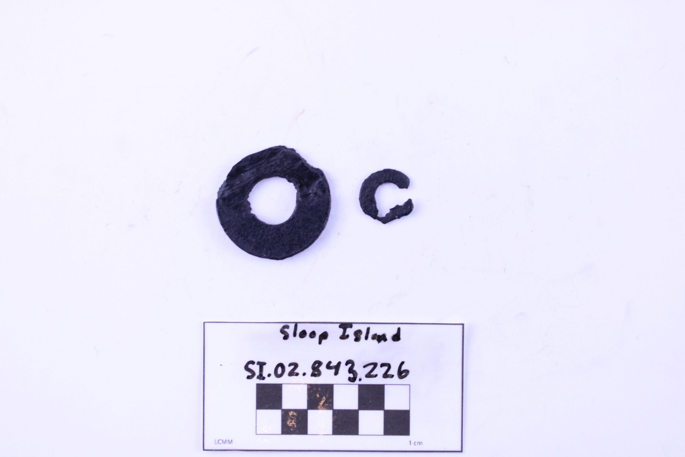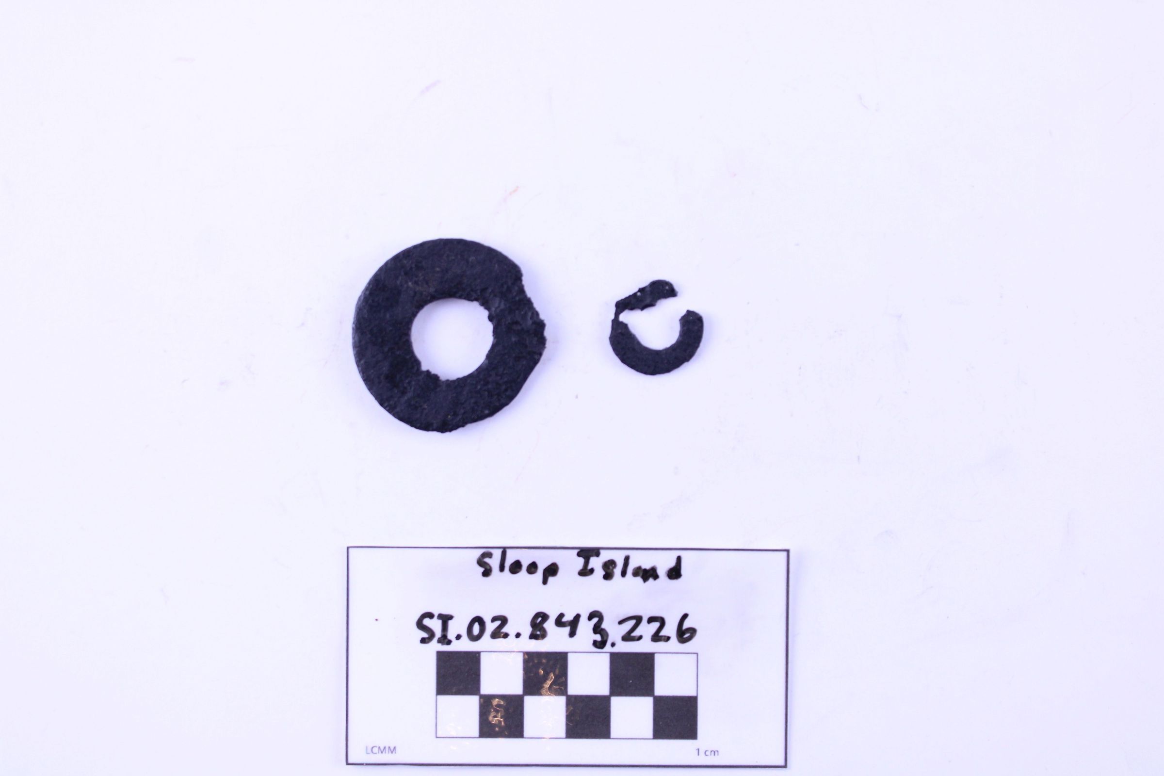 Object SI.02.843.226 is a lot of two (2) iron washers. One (1) is significantly larger than the other. The smaller of the two (2) has a small piece missing.