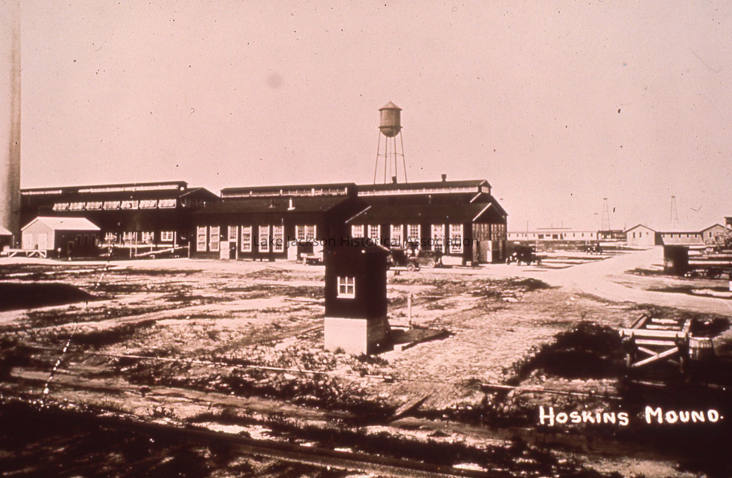 Black and white picture of buildings at Hoskins Mound with water tower in the background.Collection