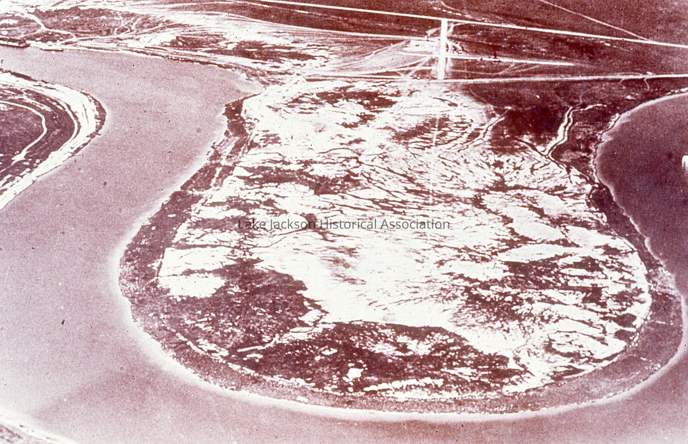 Black and white slide showing aerial view of location of Dow Chemical Plant A before construction.Collection