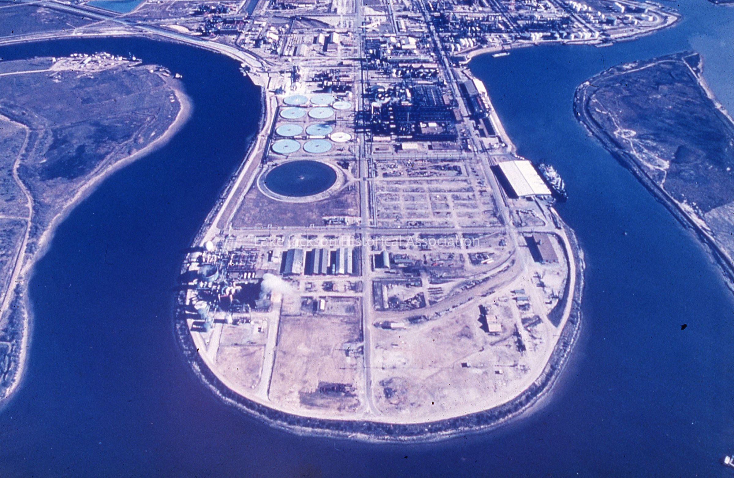 Color picture showing aerial view of Dow Chemical, Plant A. Construction is not yet completed in the picture.Collection
