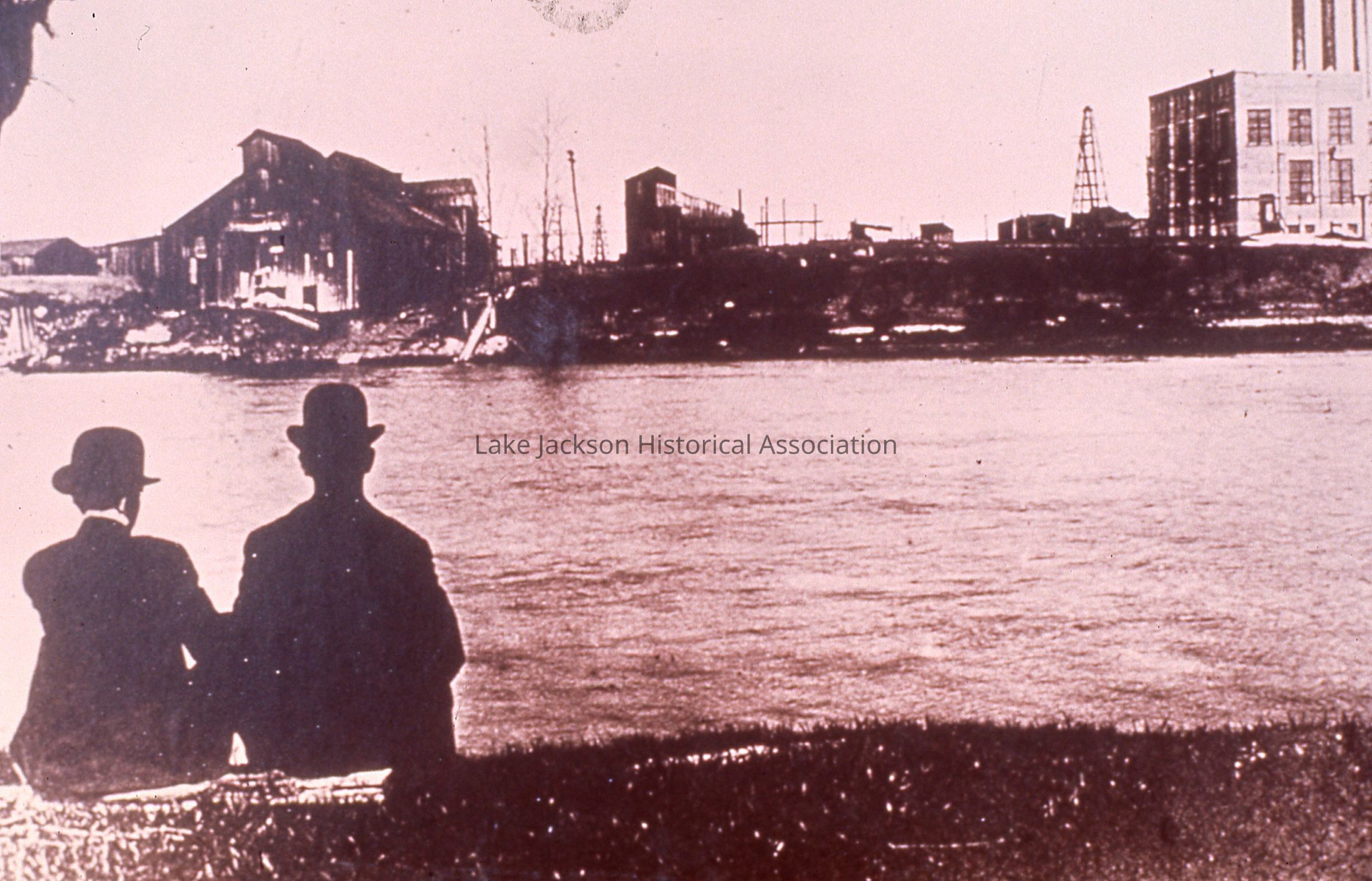 Black and White - Men Sitting on River Bank - Cooking & Some Drilling DerricksCollection