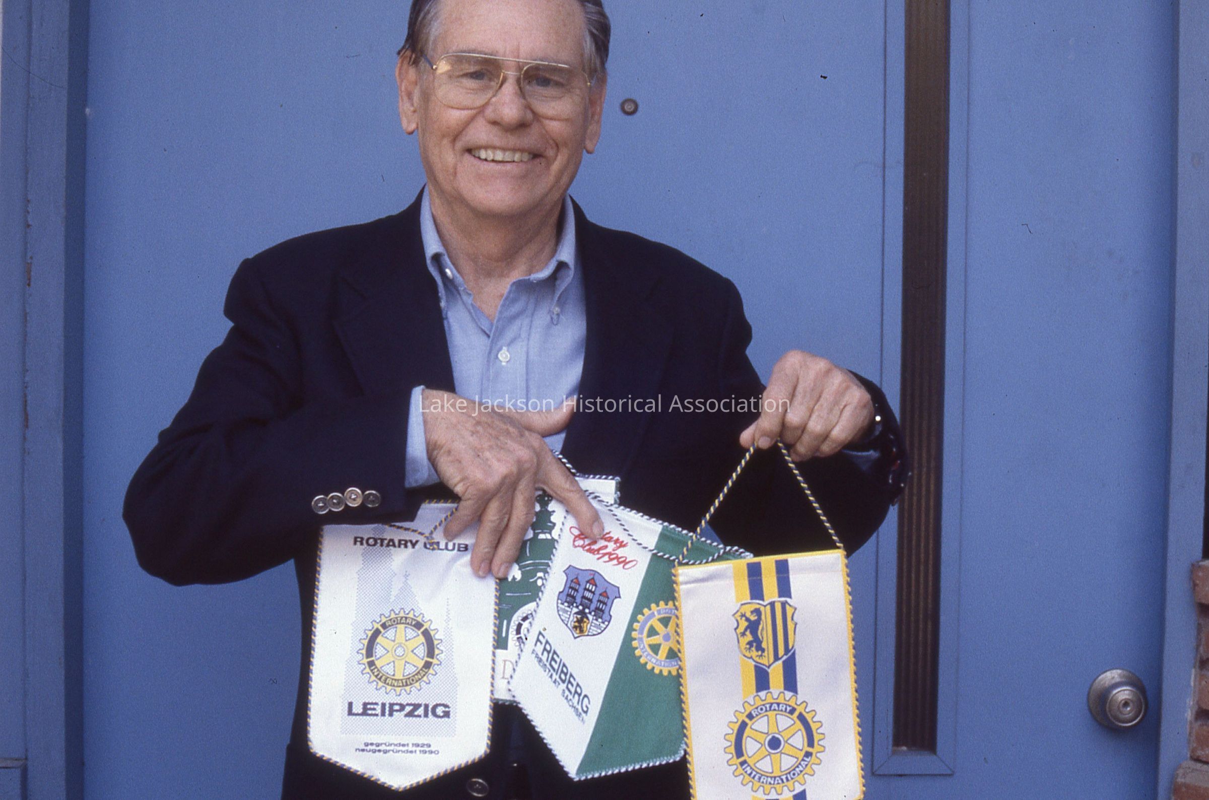 Color - Mac McClure Holding Several Small Club/Organization Banners (H.H. McClure)Collection