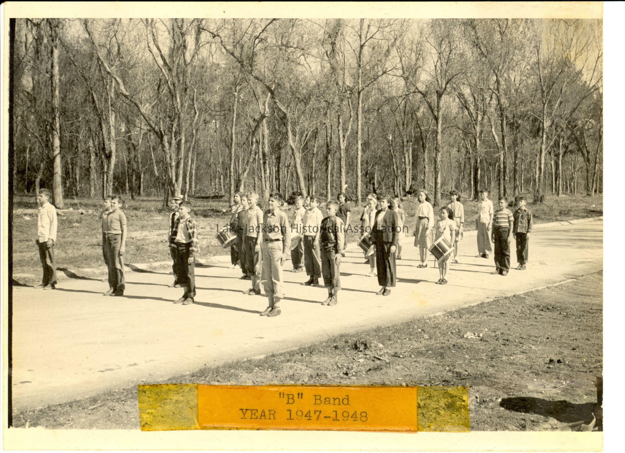 Black and white photo of Lake Jackson Intermediate School "B" Band standing on streetCollection